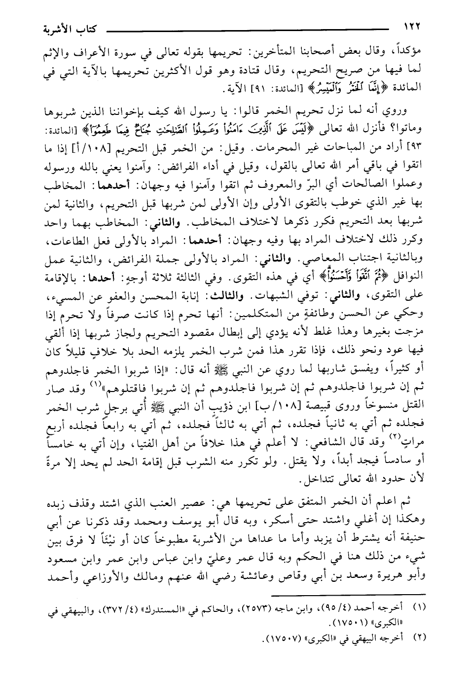 وروي أنه لما نزل تحريم الخمر قالوا: يا رسول الله كيف بإخواننا الذين شربوها وماتوا؟ فأنزل الله تعالى {لَيْسَ عَلَى الَّذِينَ آمَنُوا وَعَمِلُوا الصَّالِحَاتِ جُنَاحٌ فِيمَا طَعِمُوا} [المائدة: 93] أراد من المباحات غير المحرمات. وقيل: من الخمر قبل التحريم [108/أ] إذا ما اتقوا في باقي أمر الله تعالى بالقول، وقيل في أداء الفرائض: وآمنوا يعني بالله ورسوله وعملوا الصالحات أي البر والمعروف ثم اتقوا وآمنوا فيه وجهان: أحدهما: المخاطب بها غير الذي خوطب بالتقوى الأولى وإن الأولى لمن شربها قبل التحريم، والثانية لمن شربها بعد التحريم، والثانية لمن شربها بعد التحريم فكرر ذكرها لاختلاف المخاطب، والثاني: المخاطب بهما واحد وكرر ذلك لاختلاف المراد بها وفيه وجهان: والثاني: المخاطب بهما واحد وكرر ذلك لاختلاف المراد بها وفيه وجهان: أحدهما: المراد بالأولى فعل الطاعات، وبالثانية اجتناب المعاصي، والثاني: المراد بالأولى جملة الفرائض، والثانية عمل النوافل {ثُمَّ اتَّقَوْا وَأَحْسَنُوا} أي في هذه التقوى، وفي الثالثة ثلاثة أوجه: أحدهما: بالإقامة على التقوى، والثاني: توفي الشبهات. والثالث: إنابة المحسن والعفو عن المسيء، وحكي عن الحسن وطائفة المتكلمين: أنها تحرم إذا كانت صرفًا ولا تحرم إذا مزجت بغيرها وهذا غلط لأنه يؤدي إلى إبطال مقصود التحريمولجاز شربها إذا ألقي فيها عود ونحو ذلك، فإذا تقرر هذا فمن شرب الخمر يلزمه الحد بلا خلاف قليلًا كان أو كثيرًا، ويفسق شاربها لما روي عن النبي صلى الله عليه وسلم أنه قال: "إذا شربوا الخمر فاجلدوهم ثم إن شربوا فاجلدوهم ثم إن شربوا فاجلدوهم ثم إن شربوا فاقتلوهم" وقد صار القتل منسوخًا وروي قبيصة [108/ب] ابن ذؤيب أن النبي صلى الله عليه وسلم أتي برجل شرب الخمر فجلده ثم أتي به ثانيًا فجلده، ثم أتى به ثالثًا فجلده، ثم أتي به رابعًا فجلده أربع مرات وقد قال الشافعي: لا أعلم في هذا خلافًا من أهل الفتيا، وإن أتي به خامسًا أو سادسًا فيجد أبدًا، ولا يقتل، ولو تكررت منه الشرب قبل إقامة الحد لم يحد إلا مرة لأن حدود الله تعالى تتداخل.