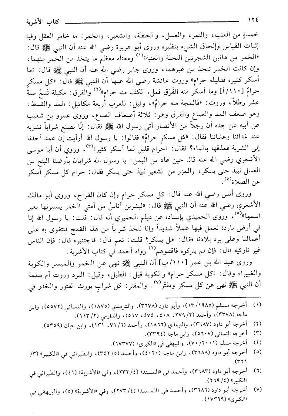 وروى أنس رضي الله عنه قال: كل مسكر حرام وإن كان القراح، وروى أبو مالك الأشعري رضي الله عنه أن النبي صلى الله عليه وسلم قال: "ليشربن أناس من أمتي الخمر يسمونها بغير اسمها"، وروى الحميدي بإسناده عن ديلم الحميري أنه قال: قلت: يا رسول الله إنا في أرض باردة نعمل فيها عملًا شديدًا، وإنا نتخذ شرابًا من هذا القمح فنتقوى به على أعمالنا وعلى برد بلادنا فقال: هل يسكر؟ قلت: نعم قال: فاجتنبوه قال: فإن الناس غير تاركيه قال: فإن لم يتركوه فاقتلوهم رواه أحمد في كتاب الأشربة.