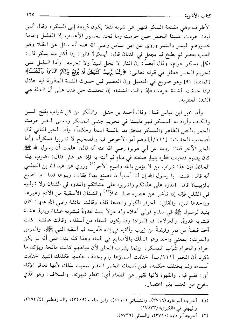 الأطراف وهي مقدمة السكر فنهى عن شربه لئلا يكون ذريعة إلى السكر، وقال أنس فيه: حرمت علينا الخمر حين حرمت وما نجد لخمور الأعناب إلا القليل وعامة خمورهم البسر والتمر وروي عن ابن عباس رضي الله عنه أنه سئل عن الطلا وهو العنب يعصر ثم يطبخ ثم يجعل في الدنان قال: أيسكر؟ قالوا: إذا أكثر منه يسكر قال: فكر مسكر حرام، وقال أيضًا: إن النار لا تحل شيئًا ولا تحرمه، وأما الدليل على تحريم الخمر فعلل في قوله تعالى: {إِنَّمَا يُرِيدُ الشَّيْطَانُ أَنْ يُوقِعَ بَيْنَكُمُ الْعَدَاوَةَ وَالْبَغْضَاءَ} [المائدة: 91] وهو صريح في التعليل وإن العصير قبل حدوث الشدة المطربة فيه حلال فإذا حدثت الشدة حرمت فإذا زالت الشدة؛ إن تحللت حل فدل على أن العلة هي الشدة المطربة.