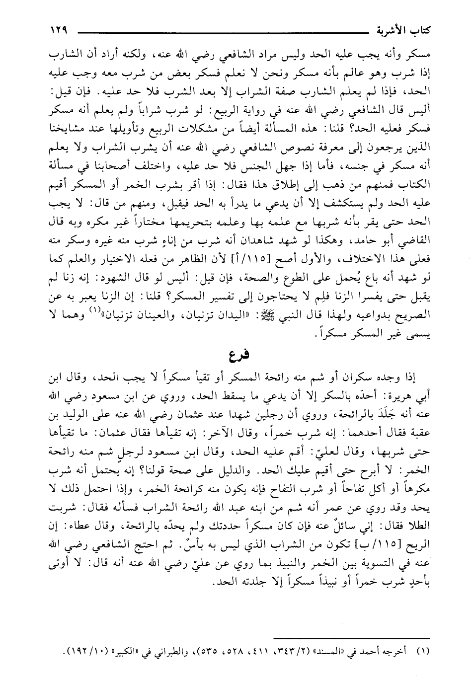 مسكر وأنه يجب عليه الحد وليس مراد الشافعي رضي الله عنه، ولكنه أراد أن الشارب إذا شرب وهو عالم بأنه مسكر ونحن لا نعلم فسكر بعض من شرب معه وجب عليه الحد، فإذا لم يعلم الشارب صفة الشراب إلا بعد الشرب فلا حد عليه، فإن قيل: أليس قال الشافعي رضي الله عنه في رواية الربيع: لو شرب شرابًا ولم يعلم أنه مسكر فسكر فعليه الحد؟ قلنا: هذه المسألة أيضًا من مشكلات الربيع وتأويلها عند مشايخنا الذين يرجعون إلى معرفة نصوص الشافعي رضي الله عنه أن يشرب الشراب ولا يعلم أنه مسكر في جنسه، فأما إذا جهل الجنس فلا حد عليه، واختلف أصحابنا في مسألة الكتاب فمنهم من ذهب إلى إطلاق هذا فقال: إذا أقر بشرب الخمر أو المسكر أقيم عليه الحد ولم يستكشف إلا أن يدعي ما يدرأ به الحد فيقبل، ومنهم من قال: لا يجب الحد حتى يقر بأنه شربها مع علمه بها وعلمه بتحريمها مختارًا غير مكره به وقال القاضي أبو حامد، وهكذا لو شهد شاهدان أنه شرب من إناء شرب منه غيره وسكر منه فعلى هذا الاختلاف، والأول أصح [115/ أ] لأن الظاهر من فعله الاختيار والعلم كما لو شهد أنه باع يحمل على الطوع والصحة، فإن قيل: أليس لو قال الشهود: إنه زنا لم يقبل حتى يفسرا الزنا فلم لا يحتاجون إلى تفسير المسكر؟ قلنا: إنه زنا لم يقبل حتى يفسرا الزنا فلم لا يحتاجون إلى تفسير المسكر؟ قلنا: إن الزنا يعبر به عن الصريح بدواعيه ولهذا قال النبي صلى الله عليه وسلم: "اليدان تزنيان، والعينان تزنيان" وهما لا يسمى غير المسكر مسكرًا.