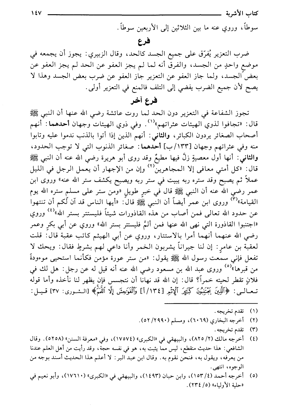 تجوز الشفاعة في التعزير دون الحد لما روت عائشة رضي الله عنها أن النبي صلى الله عليه وسلم قال: "تجافوا لذوي الهيئات عثراتهم". وفي ذوي الهيئات وجهان أحدهما: أنهم أصحاب الصغائر يردون الكبائر، والثاني: أنهم الذين إذا أتوا بالذنب ندموا عليه وتابوا منه وفي عثراتهم وجهان [133/ب] أحدهما: صغائر الذنوب التي لا توجب الحدود، والثاني أنها أول معصية زل فيها مطيع وقد روى أبو هريرة رضي الله عنه أن النبي صلى الله عليه وسلم قال: "كل أمتي معافى إلا المجاهرين" وإن من الإجهار أن يعمل الرجل في الليل عملًا ثم يصبح وقد ستره ربه يبيت في ستر ربه ويصبح يكشف ستر الله عنه" وروى ابن عمر رضي الله عنه أن النبي صلى الله عليه وسلم قال في خبر طويل "ومن ستر على مسلم ستره الله يوم القيامة" وروى ابن عمر أيضًا أن النبي صلى الله عليه وسلم قال: "أيها الناس قد آن لكم أن تنتهوا عن حدودا الله تعالى فمن أصاب من هذه القاذورات شيئًا فليستتر بستر الله" وروي "اجتنبوا القاذورة التي نهى الله عنها فمن ألم فليستتر بستر الله" وروي عن أبي بكر وعمر رضي الله عنهما أنهما أمرا بالاستتار، وروي عن أبي الهيثم كاتب عقبة قال: قلت لعقبة بن عامر: إن لنا جيرانًا يشربون بالخمر وأنا داعي لهم بشرط فقال: ويحك لا تفعل فإني سمعت رسول الله صلى الله عليه وسلم يقول: "من ستر عورة مؤمن فكأنما استحيى موءودة من قبرها" وروى عبد الله بن مسعود رضي الله عنه أنه قيل له عن رجل: هل لك في فلان تقطر لحيته خمرًا؟ قال: إن الله قد نهانا أن نتجسس فإن يظهر لنا نأخذه وأما قوله تعالى: {الَّذِينَ يَجْتَنِبُونَ كَبَائِرَ الإثْمِ [134/أ] والْفَوَاحِشَ إلاَّ اللَّمَمَ} [الشورى: 37] قيل: