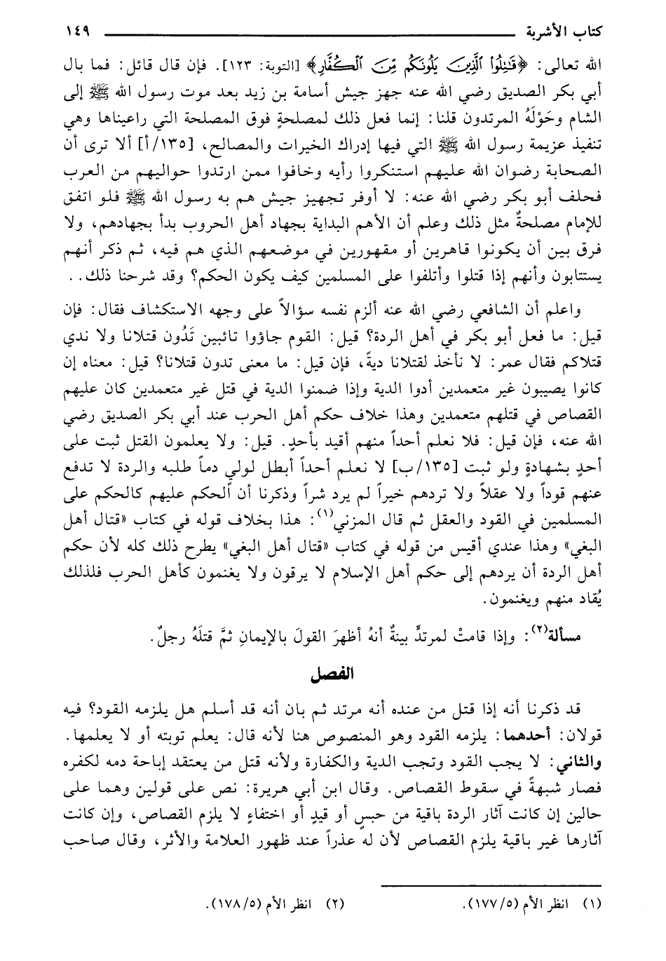 الله تعالى: {قَاتِلُوا الَّذِينَ يَلُونَكُم مِّنَ الكُفَّارِ} [التوبة 123]. فإن قال قائل: فما بال أبي بكر الصديق رضي الله عنه جهز جيش أسامة بن زيد بعد موت رسول الله صلى الله عليه وسلم حوله المرتدون قلنا: إنما فعل ذلك لمصلحة فوق المصلحة التي راعيناها وهي تنفيذ عزيمة رسول الله صلى الله عليه وسلم التي فيها إدراك الخيرات والمصالح، [135/أ] ألا ترى أن الصحابة رضوان الله عليهم استنكروا رأيه وخافواممن ارتدوا حواليهم من العرب فحلف أبو بكر رضي الله عنه: لا أوفر تجهيز جيش هم به رسول الله صلى الله عليه وسلم فلو اتفق للإمام مصلحة مثل ذلك وعلم أن الأهم البداية بجهاد أهل الحروب بدأ بجهادهم، ولا فرق بين أن يكونوا قاهرين أو مقهورين في موضعهم الذي هم فيه، ثم ذكر أنهم يستتابون وأنهم إذا قتلوا وأتلفوا على المسلمين كيف يكون الحكم. وقد شرحنا ذلك.