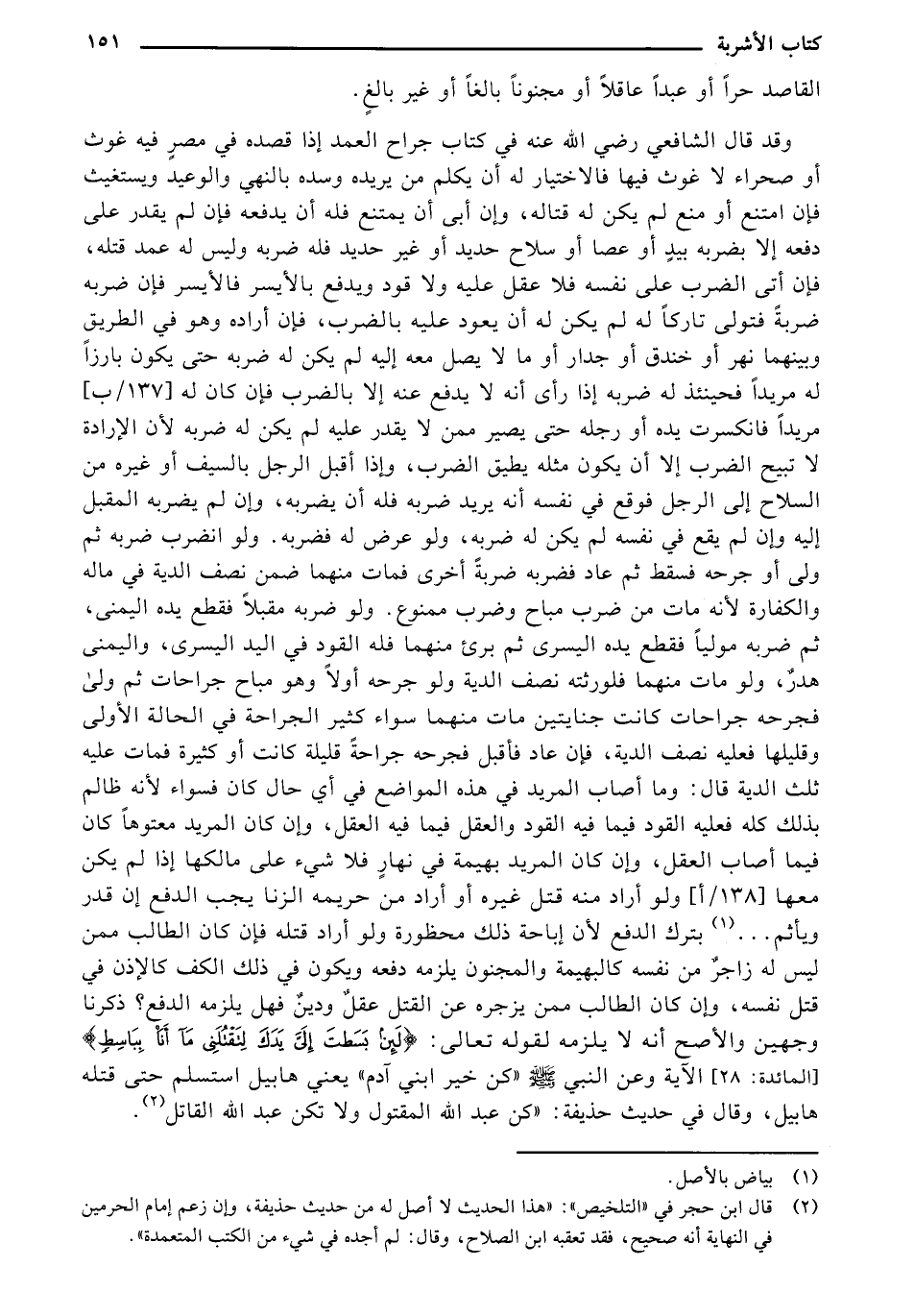 وقد قال الشافعي رضي الله عنه في كتاب جراح العمد إذا قصده في مصر فيه غوث أو صحراء لا غوث فيها فالاختيار له أن يكلم من يريده وسده بالنهي والوعيد ويستغيث فإن امتنع أو منع لم يكن له قتاله، وإن أبى أن يمتنع فله أن يدفعه فإن لم يقدر على دفعه إلا بضربة بيد أو عصا أو سلاح حديد أو غير حديد فله ضربه وليس له عمد قتله، فإن أتى الضرب على نفسه فلا عقل عليه ولا قود ويدفع بالأيسر فالأيسر فإن ضربه ضربة فتولى تاركًا له لم يكن له أن يعود عليه بالضرب، فإن أراده وهو في الطريق وبينهما نهر أو خندق أو جدار أو ما لا يصل عليه بالضرب، فإن أراده وهو في الطريق وبينهما نهر أو خندق أو جدا أو ما لا يصل معه إليه لم يكن له ضربه حتى يكون بارزًا له مريدًا فحينئذ له ضربه إذا رأى أنه لا يدفع عنه إلا بالضرب فإن كان له [137/ب] مريدًا فانكسرت يده أو رجله حتى يصير ممن لا يقدر عليه لم يكن له ضربه لأن الإرادة لا تبيح الضرب إلا أن يكون مثله يطيق الضرب، وإذا أقبل الرجل بالسيف أو غيره من السلاح إلى الرجل فوقع في نفسه أنه يريد ضربه فله أن يضربه، وإن لم يضربه المقبل إليه وإن لم يقع في نفسه لم يكن له ضربه، ولو عرض له فضربه. ولو انضرب ضربة ثم ولى أو جرحه فسقط ثم عاد فضربه ضربة أخرى فمات منهما ضمن نصف الدية في ماله والكفاءة لأنه مات منهما فلورثته نصف الدية ولو جرحه أولًا وهو مباح جراحات ثم ولى فجرحه جراحات كانت جنايتين مات منهما سواء كثير الجراحة في الحالة الأولى وقليلها فعليه نصف الدية، فإن عاد فأقبل فجرحه جراحة قليلة كانت أو كثيرة فمات عليه ثلث الدية قال: وما أصاب المريد في هذه المواضع في أي حال كان فسواء لأنه ظالم بذلك كله فعليه القود فيما فيه القود والعقل فيما فيه العقل، وإن كان المريد معتوهًا كان فيما أصاب العقل، وإن كان المريد بهيمة في نهار فلا شيء على مالكها إذا لم يكن معها [138/ أ] ولو أراد منه قتل غيره أو أراد من حريمه الزنا يجب الدفع إن قدر ويأثم ... بترك الدفع لأن إباحة ذلك محظورة ولو أراد قتله فإن كان الطالب ممن ليسه له زاجر من نفسه كالبهيمة والمجنون يلزمه دفعه ويكون في ذلك الكف كالإذن في قتل نفسه، وإن كان الطالب ممن يزجره عن القتل عقل ودين فهل يلزمه الدفع؟ ذكرنا وجهين والأصح أنه لا يلزمه لقوله تعالى: {لَئِن بَسَطتَ إلَيَّ يَدَكَ لِتَقْتُلَنِي مَا أَنَا بِبَاسِطٍ} [المائدة 28] الآية وعن النبي صلى الله عليه وسلم "كن خير ابني آدم" يعني هابيل استسلم حتى قتله هابيل، وقال في حديث حذيفة: "كن عبد الله المقتول ولا تكن عبد الله القاتل".