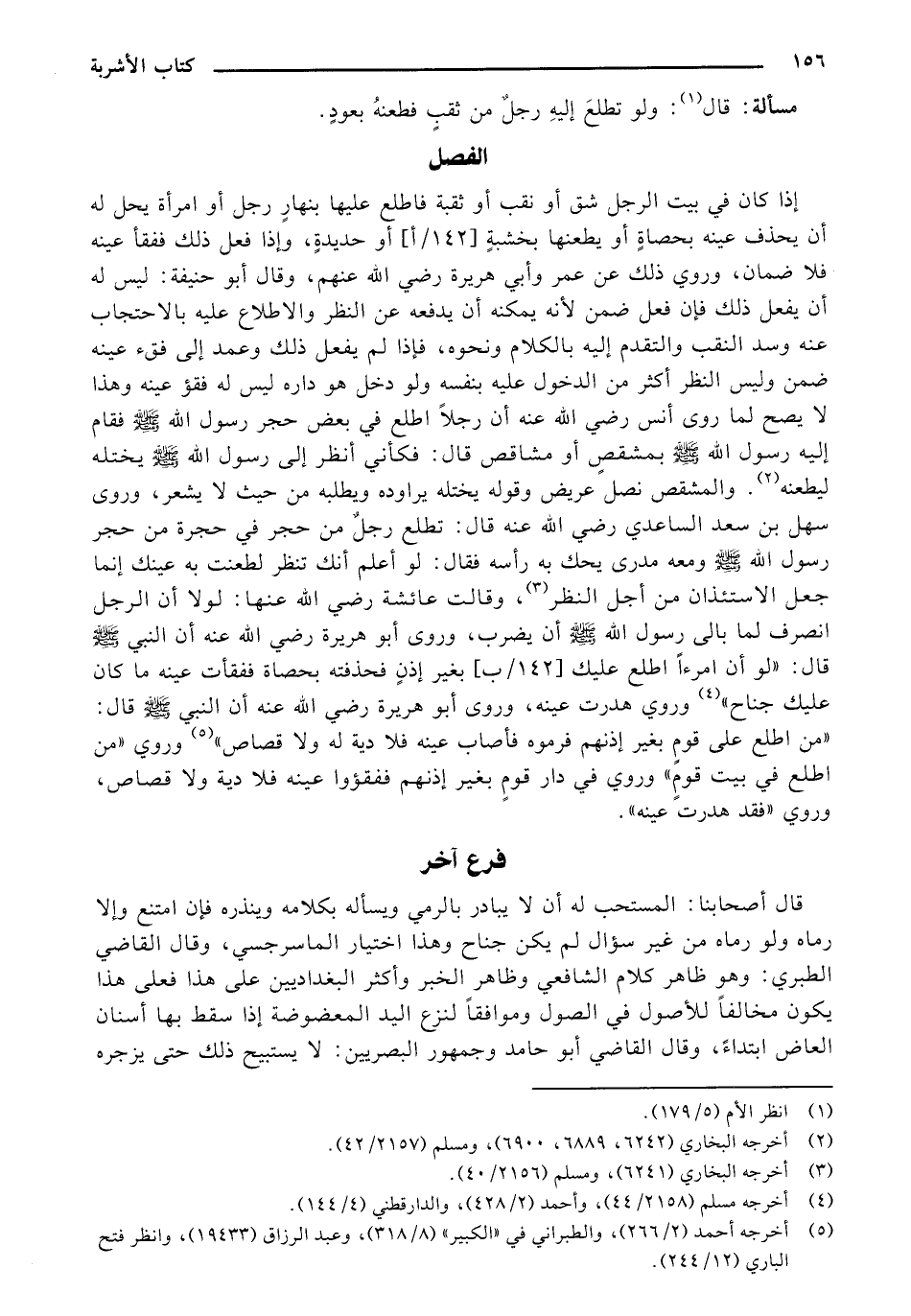 إذا كان في بيت الرجل شق أو نقب أو ثقبه فاطلع عليها بنهار رجل أو امرأة يحل له أن يحذف عينه بحصاة أو يطعنها بخشبة [142/أ] أو حديدة، وإذا فعل ذلك ففقأ عينه فلا ضمان، وروي ذلك عن عمر وأبي هريرة رضي الله عنهم، وقال أبو حنيفة: ليس له أن يفعل ذلك فإن فعل ضمن لأنه يمكنه أن يدفعه عن النظر والاطلاع عليه بالاحتجاب عنه وسد النقب والتقدم إليه بالكلام ونحوه، فإذا لم يفعل ذلك وعمد إلى فقء عينه ضمن وليس النظر أكثر من الدخول عليه بنفسه ولو دخل هو داره ليس له فقؤ عينه وهذا لا يصح لما روى أنس رضي الله عنه أن رجلًا اطلع في بعض حجر رسول الله صلى الله عليه وسلم فقام إليه رسول الله صلى الله عليه وسلم بمشقص أو مشاقص قال: فكأني أنظر إلى رسول الله صلى الله عليه وسلم يختله يطعنه. والمشقص نصل عريض وقوله يختله يراوده ويطلبه من حيث لا يشعر، وروى سهل بن الساعدي رضي الله عنه قال: تطلع رجل من حجر في حجرة من حجر رسول الله صلى الله عليه وسلم ومعه مدرى يحك به رأسه فقال: لو أعلم أنك تنظر لطعنت به عينك إنما جعل الاستئذان من أجل النظر، وقالت عائشة رضي الله عنها: لولا أن الرجل انصرف لما بالى رسول الله صلى الله عليه وسلم أن يضرب، وروى أبو هريرة رضي الله عنه أن النبي صلى الله عليه وسلم قال: "لو أن امرءًا اطلع عليك [142/ب] بغير إذن فحذفته بحصاة ففقأت عينه ما كان عليك جناح" وروي هدرت عينه، وروي أبو هريرة رضي الله عنه أن النبي صلى الله عليه وسلم قال: "من اطلع على قوم بغير إذنهم فرموه فأصاب عينه فلا دية له ولا قصاص" وروي "من اطلع في بيت قوم" وروي في دار قوم بغير إذنهم ففقؤا عينه فلا دية ولا قصاص، وروي "فقد هدرت عينه".