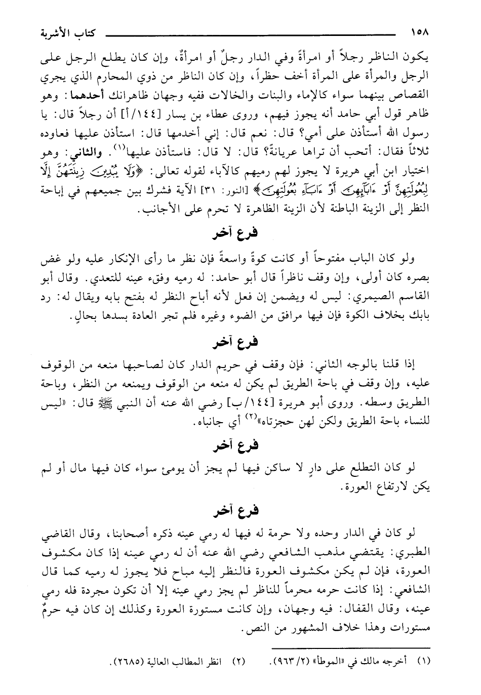 إذا قلنا بالوجه الثاني: فإن وقف في حريم الدار كان لصاحبها منعه من الوقوف عليه، وإن وقف في باحة الطريق لم يكن له منعه من الوقوف ويمنعه من النظر، وباحة الطريق وسطه. وروى أبو هريرة [144/ب] رضي الله عنه أن النبي صلى الله عليه وسلم قال: "ليس للنساء باحة الطريق ولكن لهن حجزتاه" أي جانباه.