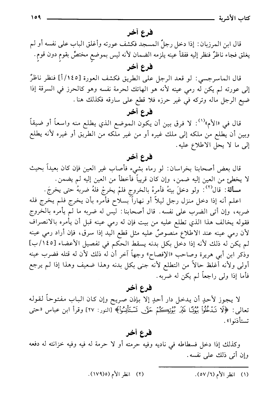 لا يجوز لأحد أن يدخل دار أحد إلا بإذن صريح وإن كان الباب مفتوحًا لقوله تعالى: {تَدْخُلُوا بُيُوتًا غَيْرَ بُيُوتِكُمْ حَتَّى تَسْتَانِسُوا وتُسَلِّمُوا} [النور 27] وقرأ ابن عباس "حتى تستأذنوا".