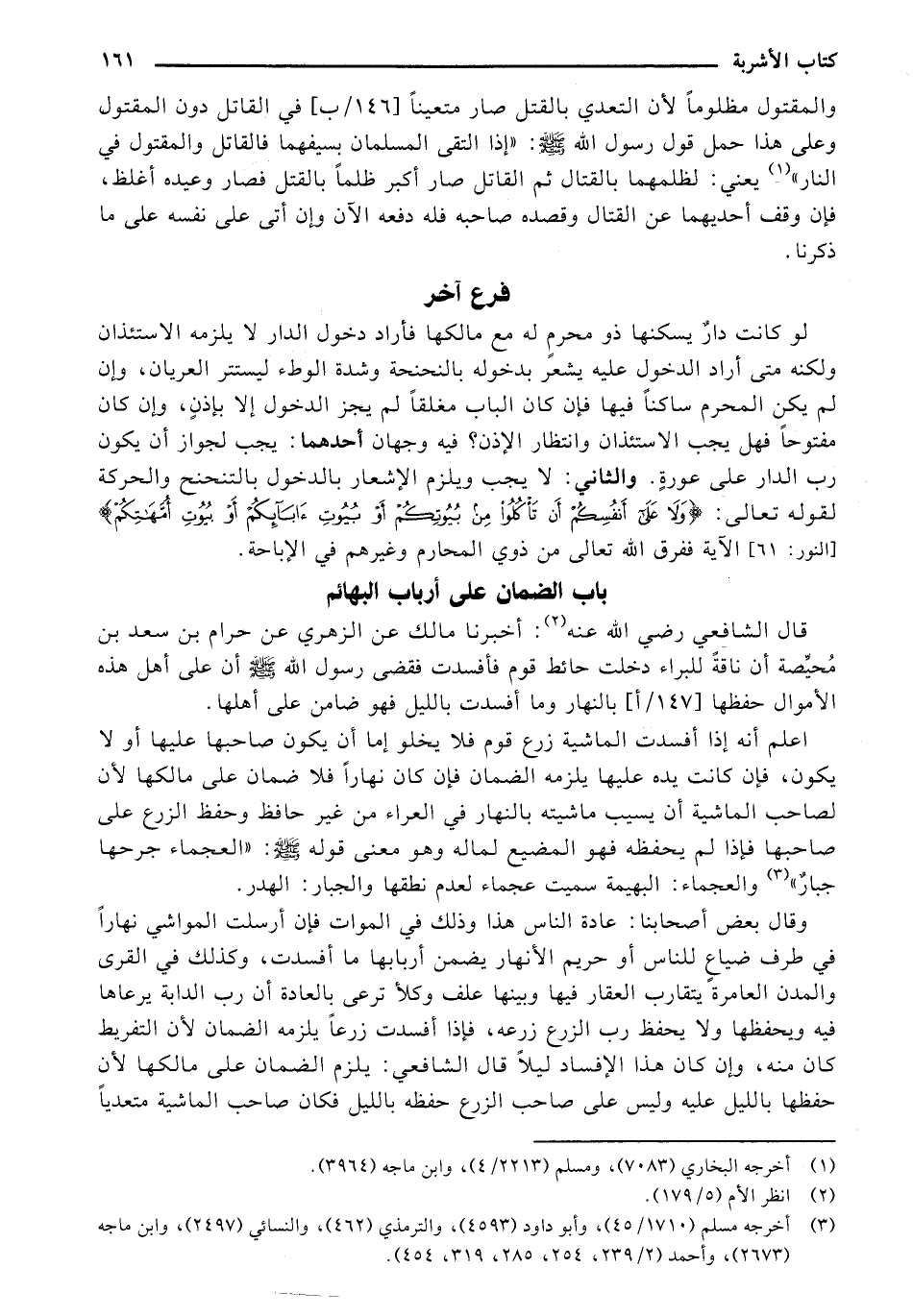 قال الشافعي رضي الله عنه: أخبرنا مالك عن الزهري عن حرام بن سعد محيصة أن ناقة للبراء دخلت حائط قوم فأفسدت فقضى رسول الله صلى الله عليه وسلم أن على أهل هذه الأموال حفظها [147/أ] بالنهار وما أفسدت بالليل فهو ضامن على أهلها.
