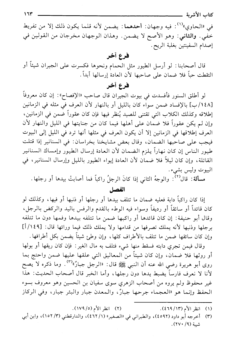 وقال فيمن تجري دابته فسقط منها شيء فتلف به مال الغير: فإن كان ريقها أو بولها أو روثها فلا ضمان، وإن كان شيئًا من المعاليق التي علقها عليها ضمن واحتج بما روى أبو هريرة رضي الله عنه أن النبي صلى الله عليه وسلم قال: "الرجل جبار". وما ذكره لا يصح لأنا لا نعارف فارسًا يضبط يدها دون رجلها، وأما الخبر قال أصحاب الحديث: هذا غير محفوظ ولم يروه من أصحاب الزهري سوى سفيان بن الحسين وهو معروف بسوء الحفظ وإنما هو "العجماء جرحها جبار، والمعدن جبار والبثر جبار، وفي الركاز