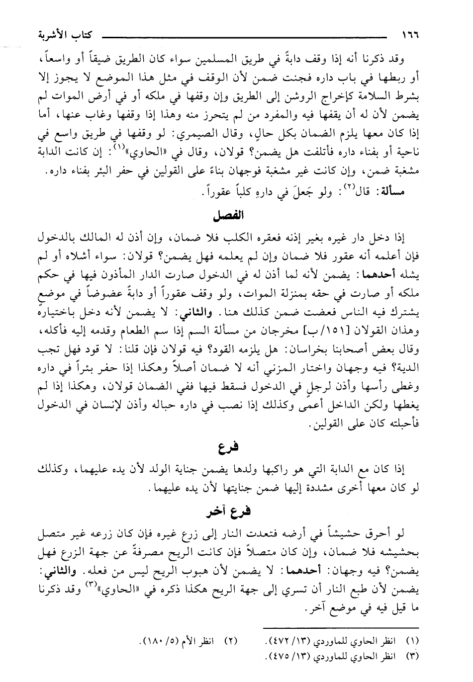 لو أحرق حشيشًا في أرضه فتعدت النار إلى زرع غيره فإن كان زرعه غير متصل بحشيشه فلا ضمان، وإن كان متصلًا فإن كانت الريح مصرفة عن جهة الزرع فهل يضمن؟ فيه وجهان: أحدهما: لا يضمن لأن هبوب الريح ليس من فعله. والثاني: يضمن لأن طبع النار أن تسري إلى جهة الريح هكذا ذكره في (الحاوي) وقد ذكرنا ما قيل في موضع آخر.