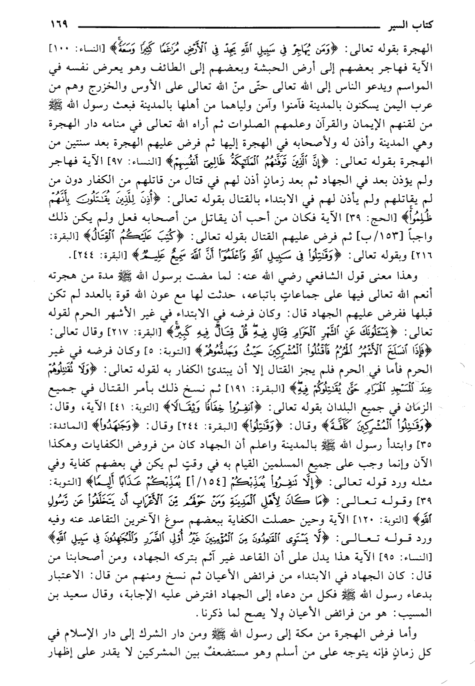 وهذا معنى قول الشافعي رضي الله عنه: لما مضت برسول الله صلى الله عليه وسلم مدة من هجرته أنعم الله تعالى فيها على جماعات بإتباعه، حدثت لها مع عون الله قوة بالعدد لم تكن قبلها ففرض عليهم الجهاد قال: وكان فرضه في الابتداء في غير الأشهر الحرم لقوله تعالى: {يَسْأَلُونَكَ عَنِ الشَّهْرِ الحَرَامِ قِتَالٍ فِيهِ قُلْ قِتَالٌ فِيهِ كَبِيرٌ} [البقرة 217] وقال تعالى: {فَإذَا انسَلَخَ الأَشْهُرُ الحُرُمُ فَاقْتُلُوا المُشْرِكِينَ حَيْثُ وجَدتُّمُوهُمْ} [التوبة 5] وكان فرضه في غير الحرم فأما في الحرم فلم يجز القتال إلا أن يبتدئ الكفار به لقوله تعالى: {ولا تُقَاتِلُوهُمْ عِندَ المَسْجِدِ الحَرَامِ حَتَّى يُقَاتِلُوكُمْ} [البقرة 191] ثم نسخ ذلك بأمر القتال في جميع الزمان في جميع البلدان بقوله تعالى: {انفِرُوا خِفَافًا وثِقَالاً} [التوبة 41] الآية، وقال {وقَاتِلُوا المُشْرِكِينَ كَافَّةً} وقال: {وقَاتِلُوا} [البقرة 244] وقال: {وجَاهِدُوا} [المائدة 35] وابتدأ رسول الله صلى الله عليه وسلم بالمدينة واعلم أن الجهاد كان من فروض الكفايات وهكذا الآن وإنما وجب على جميع المسلمين القيام به في وقت لم يكن في بعضهم كفاية وفي مثله ورد قوله تعالى: {إلاَّ تَنفِرُوا يُعَذِّبْكُمْ [154/أ] عَذَابًا أَلِيمًا} [التوبة 39] وقوله تعالى: {مَا كَانَ لأَهْلِ المَدِينَةِ ومَنْ حَوْلَهُم مِّنَ الأَعْرَابِ أَن يَتَخَلَّفُوا عَن رَّسُولِ اللَّهِ} [التوبة 120] الآية. وحين حصلت الكفاية ببعضهم سوغ الآخرين التقاعد عنه وفيه ورد قوله تعالى: {لا يَسْتَوِي القَاعِدُونَ مِنَ المُؤْمِنِينَ غَيْرُ أُوْلِي الضَّرَرِ والْمُجَاهِدُونَ فِي سَبِيلِ اللَّهِ} [النساء 95] الآية. هذا يدل على أن القاعد غير آثم بتركه الجهاد، ومن أصحابنا من قال: كان الجهاد في الابتداء من فرائض الأعيان ثم نسخ ومنهم من قال: الاعتبار بدعاء رسول الله صلى الله عليه وسلم فكل من دعاه إلى الجهاد افترض عليه الإجابة، وقال سعيد بن المسيب: هو من فرائض الأعيان ولا يصح لما ذكرنا.