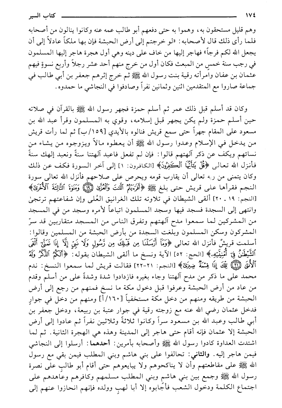 وكان قد أسلم قبل ذلك عمر ثم أسلم حمزة فجهر رسول الله صل الله عليه وسلم بالقرآن في صلاته حين أسلم حمزة ولم يكن يجهر قبل إسلامه، وقوي به المسلمون وقرأ عبد الله بن مسعود على المقام جهراً حتى سمع قريش فنالوه بالأيدي [159/ب] ثم رأت قريش من يدخل في الإسلام وعدوا رسول الله صل الله عليه وسلم أن يعطوه مالاً ويزوجوه من يشاء من نسائهم ويكف نسائهم ويكف عن ذكر آلهتهم قالوا: فإن لم تفعل فاعبد آلهتنا سنة ونعبد إلهك سنة فأنزل الله تعالى {قُلْ يَا أَيُّهَا الكَافِرُونَ} [الكافرون: 1] إلى آخر السورة فكف عن ذلك وكان يتمنى من ربه تعالى أن يقارب قومه ويحرص على صلاحهم فأنزل الله تعالى سورة النجم فقرأها على قريش حتى بلغ صل الله عليه وسلم {أَفَرَأَيْتُمُ اللاَّتَ والْعُزَّى (19) ومَنَاةَ الثَّالِثَةَ الأُخْرَى} [النجم: 19 - 20] ألقى الشيطان في تلاوته تلك الغرانيق العلى وإن شفاعتهم ترتجى وانتهى إلى السجدة فسجد فيها وسجد المسلمون إتباعاً لأمره وسجد من في المسجد من المشركين لما سمعوا مدح آلهتهم وتفرق الناس من المسجد متقاربين قد سر المشركون وسكن المسلمون وبلغت السجدة من بأرض الحبشة من المسلمين وقالوا أسلمت قريش فأنزل الله تعالى {وَمَا أَرْسَلْنَا مِن قَبْلِكَ مِن رَّسُولٍ وَلا نَبِيٍّ إلاَّ إذَا تَمَنَّى أَلْقَى الشَّيْطَانُ فِي أُمْنِيَّتِهِ} [الحج:52] الآية ونسخ ما ألقى الشيطان بقوله: {أَلَكُمُ الذَّكَرُ ولَهُ الأُنثَى (21) تِلْكَ إذًًا قِسْمَةٌ ضِيزَى} [النجم: 21 - 22] فقالت قريش لما سمعوا النسخ: ندم محمد على ما ذكر من مدح آلهتنا وجاء بغيره فازدادوا شدة وشدة على من أسلم وقدم من عاد من أرض الحبشة وعرفوا قبل دخول مكة ما نسخ فمنهم من رجع إلى أرض الحبشة من طريقه ومنهم من دخل مكة مستخفياً [160/أ] ومنهم من دخل في جوار فدخل عثمان رضي الله عنه مع زوجته رقية في جوار عتبة بن ربيعة، ودخل جعفر بن أبي طالب وعبد الله بن مسعود سراً وكانوا ثلاثة وثلاثين نفراً ثم عادوا إلى أرض الحبشة إلا عثمان فإنه أقام حتى هاجر إلى المدينة وهذه هي الهجرة الثانية. ثم لما اشتدت العداوة كادوا رسول الله صل الله عليه وسلم وأصحابه بأمرين: أحدهما: أرسلوا إلى النجاشي فيمن هاجر إليه. والثاني: تحالفوا على بني هاشم وبني المطلب فيمن بقي مع رسول الله صل الله عليه وسلم على مقاطعتهم وأن يناكحوهم ولا يبايعوهم حتى أقام أبو طالب على نصرة رسول الله صل الله عليه وسلم وجمع بين بني هاشم وبني المطلب مسلمهم وكافرهم وعاهدهم على اجتماع الكلمة ودخول الشعب فأجابوه إلا أبا لهبٍ وولده فإنهم انحازوا عنهم إلى
