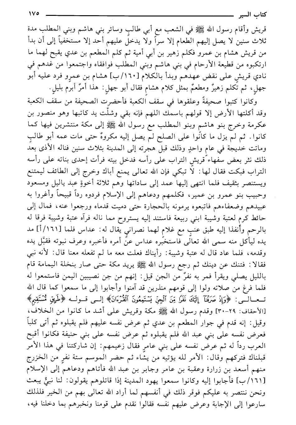 قريش وأقام رسول الله صل الله عليه وسلم في الشعب مع أبي طالبٍ وسائر بني هاشم وبني المطلب مدة ثلاث سنين لا يصل إليهم الطعام إلا سراً ولا يدخل عليهم أحد إلا مستخفياً إلى أن بدأ من قريش هشام بن عمرو فكلم زهير بن أبي أمية ثم كلم المطعم بن عدي يقبح لهما ما ارتكبوه من قطيعة الأرحام في بني هاشم وبني المطلب فوافقاه واجتمعوا من غدهم في نادي قريش على نقض عهدهم وبدأ بالكلام [160/ب] هشام بن عمرٍو فرد عليه أبو جهلٍ، ثم تكلم زهيرٌ ومطعمٌ بمثل كلام هشامِ فقال أبو جهلٍ: هذا أمرٌ أبرم بليلٍ.