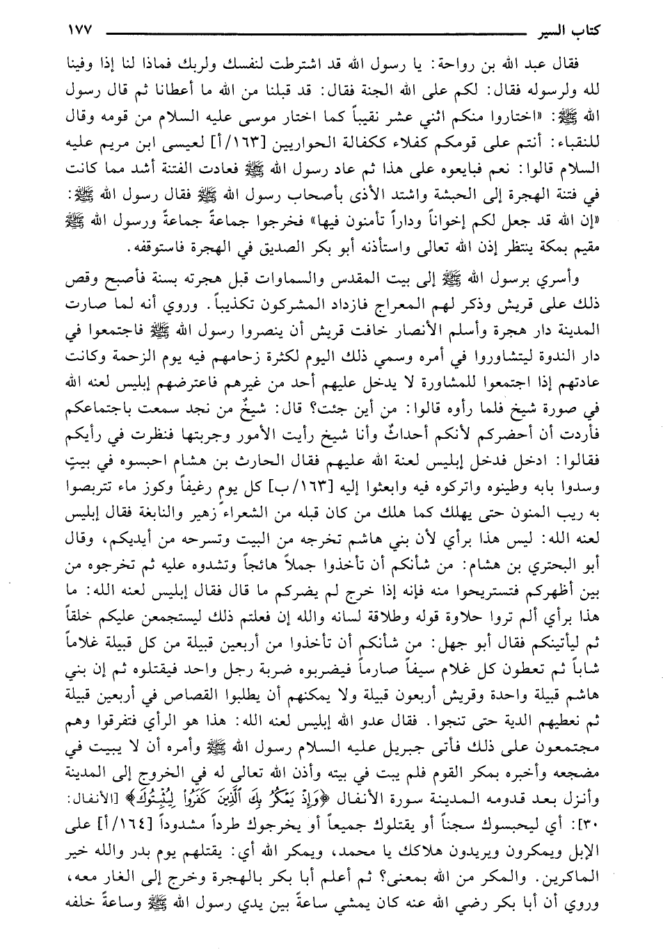 وأسريب رسول الله صل الله عليه وسلم إلى بيت المقدس والسماوات قبل هجرته بسنة فأصبح وقص ذلك على قريش وذكر لهم المعراج فازداد المشركون تكذيباً. وروي أنه لما صارت المدينة دار هجرة وأسلم الأنصار خافت قريش أن ينصروا رسول الله صل الله عليه وسلم فاجتمعوا في دار الندوة ليتشاوروا في أمره وسمي ذلك اليوم لكثرة زحامهم فيه يوم الزحمة وكانت عادتهم إذا اجتمعوا للمشاورة لا يدخل عليهم أحد من غيرهم فاعترضهم إبليس لعنه الله في صورة شيخ فلما رأوه قالوا: من أين جئت؟ قال: شيخ من نجد سمعت باجتماعكم فأردت أن أحضركم لأنكم أحداث وأنا شيخ رأيت الأمور وجربتها فنظرت في رأيكم فقالوا: ادخل فدخل إبليس لعنة الله عليهم فقال الحارث بن هشام احبسوه في بيت وسدوا بابه وطينوه واتركوه فيه وابعثوا إليه [163/ب] كل يوم رغيفاً وكوز ماء تتربصوا به ريب المنون حتى يهلك كما هلك من كان قبله من الشعراء زهير والنابغة فقال إبليس لعنه الله: ليس هذا برأي لأن بني هاشم تخرجه من البيت وتسرحه من أيديكم، وقال أبو البحتري بن هشام: من شأنكم أن تأخذوا جملاً هائجاً وتشدوه عليه ثم تخرجوه من بين أظهركم فتستريحوا منه فإنه إذا خرج لم يضركم ما قال فقال إبليس لعنه الله: ما هذا برأي ألم تروا حلاوة قوله وطلاقة لسانه والله إن فعلتم ذلك ليستجمعن عليكم خلقاً ثم ليأتينكم فقال أبو جهل: من شانكم أن تأخذوا من أربعين قبيلة من كل قبيلة غلاماً شاباً ثم تعطون كل غلام سيفاً صارماً فيضربوه ضربة رجل واحد فيقتلوه ثم إن بني هاشم قبيلة واحدة وقريش أربعون قبيلة ولا يمكنهم أن يطلبوا القصاص في أربعين قبيلة ثم نعطيهم الدية حتى تنجوا. فقال عدو الله إبليس لعنه الله: هذا هو الرأي فتفرقوا وهم مجتمعون على ذلك فأتى جبريل عليه السلام رسول الله صل الله عليه وسلم وأمره أن لا يبيت في مضجعه وأخبره بمكر القوم فلم يبت في بيته وأذن الله تعالى له في الخروج إلى المدينة وأنزل بعد قدومه المدينة سورة الأنفال {وإذْ يَمْكُرُ بِكَ الَّذِينَ كَفَرُوا لِيُثْبِتُوكَ} [الأنفال: 30] أي ليحسبوك سجناً أو يقتلوك جميعاً أو يخرجوك طرداً مشدوداً [164/أ] على الإبل ويمكرون ويريدون هلاكك يا محمد، ويمكر الله أي: يقتلهم يوم بدر والله خير الماكرين. والمكر من الله بمعنى؟ ثم أعلم أبا بكر بالهجرة وخرج إلى الغار معه، وروي أن أبا بكر رضي الله عنه كان يمشي ساعة بين يدي رسول الله صل الله عليه وسلم وساعة خلفه