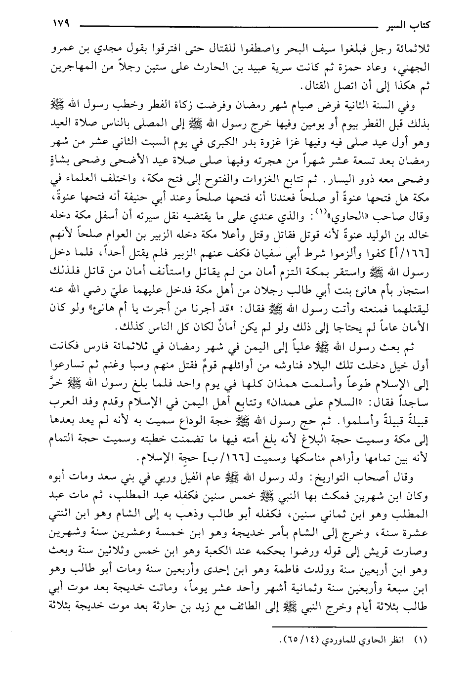 وفي السنة الثانية فرض صيام شهر رمضان وفرضت زكاة الفطر وخطب رسول الله صل الله عليه وسلم بذلك قبل الفطر بيوم أو يومين وفيها خرج رسول الله صل الله عليه وسلم إلى المصلى بالناس صلاة العيد وهو أول عيد صلى فيه وفيها غزا غزوة بدر الكبرى في يوم السبت الثاني عشر من شهر رمضان بعد تسعة عشر شهراً من هجرته وفيها صلى صلاة عيد الضحى وضحى بشاةٍ وضحى معه ذوو اليسار. ثم تتابع الغزوات والفتوح إلى فتح مكة، واختلف العلماء في مكة هل فتحها عنوة أو صلحاً فعندنا أنه فتحها صلحاً وعند أبي حنيفة أنه فتحها عنوة، وقال صاحب "الحاوي ": والذي عندي على ما يقتضيه نقل سيرته أن أسفل مكة دخله خالد بن الوليد عنوة لأنه قوتل فقاتل وقتل وأعلا مكة دخله الزبير بن العوام صلحاً لأنهم [166/أ] كفوا وألزموا شرط أبي سفيان فكف عنهم الزبير فلم يقتل أحداً، فلما دخل رسول الله صل الله عليه وسلم واستقر بمكة التزم أمان من لم يقاتل واستأنف أمان من قاتل فلذلك استجار بأم هانئ بنت أبي طالب رجلان من أهل مكة فدخل عليهما علي رضي الله عنه ليقتلهما فمنعته وأتت رسول الله صل الله عليه وسلم فقال: "قد أجرنا من أجرت يا أم هانئ "ولو كان الأمان عاماً لم يحتاجا إلى ذلك ولو لم يكن أمان لكان كل الناس كذلك.