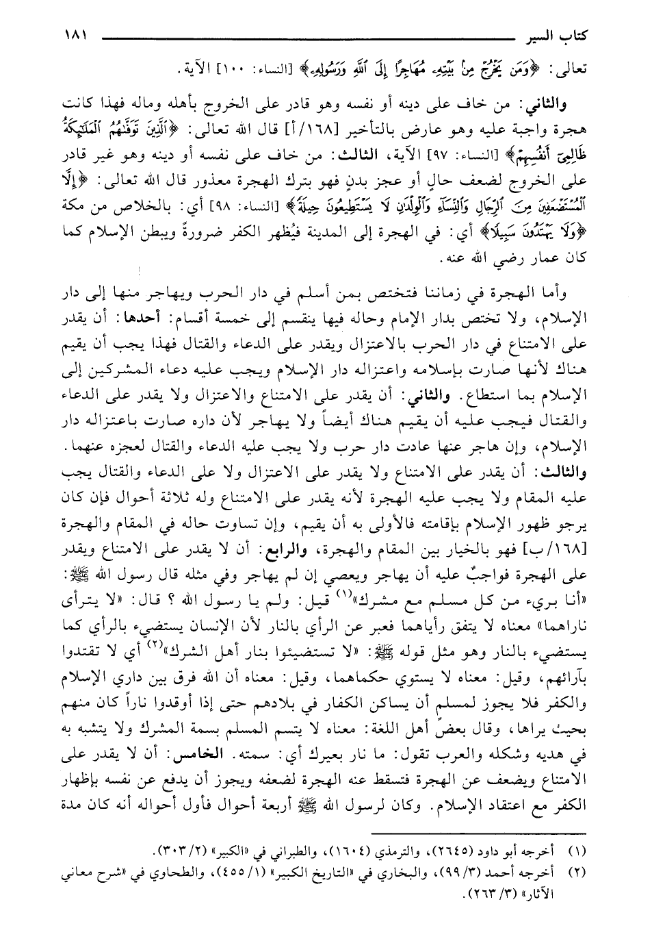 وأما الهجرة في زماننا فتختص بمن أسلم في دار الحرب ويهاجر منها إلى دار الإسلام، ولا تختص بدار الإمام وحاله فيها ينقسم إلى خمسة أقسام: أحدهما: أن يقدر على الامتناع في دار الحرب بالاعتزال ويقدر على الدعاء والقتال فهذا يجب أن يقيم هناك لأنها صارت بإسلامه واعتزاله دار الإسلام ويجب عليه دعاء المشركين إلى الإسلام بما استطاع. والثاني: أن يقدر على الامتناع والاعتزال ولا يقدر على الدعاء والقتال فيجب عليه أن يقيم هناك أيضًا ولا يهاجر لأن داره صارت باعتزاله دار الإسلام، وإن هاجر عنها عادت دار حرب ولا يجب عليه الدعاء والقتال لعجزه عنهما. والثالث: أن يقدر على الامتناع ولا يقدر على الاعتزال ولا على الدعاء والقتال يجب عليه المقام ولا يجب عليه الهجرة لأنه يقدر على الامتناع وله ثلاثة أحوال فإن كان يرجو ظهور الإسلام بإقامته فالأولى به أن يقيم، وإن تساوت حاله في المقام والهجرة [168/ب] فهو بالخيار بين المقام والهجرة، والرابع: أن لا يقدر على الامتناع ويقدر على الهجرة فواجب عليه أن يهاجر ويعصي إن لم يهاجر وفي مثله قال رسول الله صلى الله عليه وسلم: ((أنا برئ من كل مسلم مع مشرك)) قيل: ولم يا رسول الله؟ قال: ((لا يترأى نارهما)) معناه لا يتفق رأياهما فعبر عن الرأي بالنار لأن الإنسان يستضيء بالرأي كما يستضيء بالنار وهو مثل قوله صلى الله عليه وسلم: ((لا تستضيئوا بنار أهل الشرك)) أي لا تقتدوا بآرائهم، وقيل: معناه لا يستوي حكماهما، وقيل: معناه أن الله فرق بين داري الإسلام والكفر فلا يجوز لمسلم أن يساكن المفار في بلادهم حتى إذا أوقدوا نارًا كان منهم بحيث يراها، وقال بعض أهل اللغة: معناه لا يتسم المسلم بسمة المشرك ولا يتشبه به في هديه وشكله والعرب تقول: ما نار بعيرك أي: سمته. الخامس: أن لا يقدر على الامتناع ويضعف عن الهجرة فتسقط عنه الهجرة لضعفه ويجوز أن يدفع عن نفسه بإظهار الكفر مع اعتقاد الإسلام. وكان لرسول الله صلى الله عليه وسلم أربعة أحوال فأول أحواله أنه كان مدة