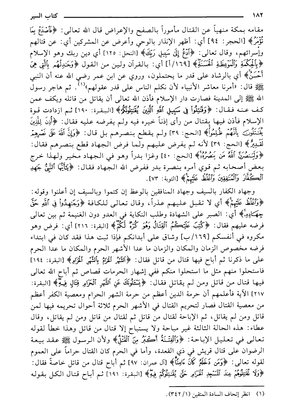 مقامه بمكة منهيًا عن القتال مأمورٍا بالصفح والإعراض قال الله تعالى: {فَاصْدَعْ بِمَا تُؤْمَرُ}] الحجر: 94] أي: أظهر الإنذار بالوحي وأعرض عن المشركين أي: عن قتالهم وإسرائهم، وقال تعالى: {ادْعُ إِلَى سَبِيلِ رَبِّكَ}] النحل: 125] أي دين ربك وهو الإسلام {بِالْحِكْمَةِ وَالْمَوْعِظَةِ الْحَسَنَةِ}] 169/أ] أي: بالقرآن ولين من القول {وَجَادِلْهُمْ بِالَّتِي هِيَ أَحْسَنُ} أي بالرشاد على قدر ما يحتملون، وروي عن ابن عمر رضي الله أن النبي صلى الله عليه وسلم قال: ((أمرنا معاشر الأنبياء لأن نكلم الناس على قدر عقولهم)). ثم هاجر رسول الله صلى الله عليه وسلم إلى المدينة فصارت دار الإسلام فأذن الله تعالى أن يقاتل من قاتله ويكف عمن كف عنه فقال: {وَقَاتِلُوا فِي سَبِيلِ اللَّهِ الَّذِينَ يُقَاتِلُونَكُمْ}] البقرة: 190] ثم ازدادت قوة الإسلام فأذن فيها بقتال من رأى إذنًا خيره فيه ولم يفرضه عليه فقال: {أُذِنَ لِلَّذِينَ يُقَاتَلُونَ بِأَنَّهُمْ ظُلِمُوا}] الحج: 39] ولم يقطع بنصرهم بل قال: {إِنَّ اللَّهَ عَلَى نَصْرِهِمْ لَقَدِيرٌ} [الحج: 39] لأنه لم يفرض عليهم ولما فرض الجهاد قطع بنصرهم فقال: {وَلَيَنْصُرَنَّ اللَّهُ مَنْ يَنْصُرُهُ}] الحج: 40] وغزا بدرًا وهو في الجهاد مخير ولهذا خرج بعض أصحابه ثم قوي أمره بنصرة بدر ففرض الله الجهاد فقال: {يَا أَيُّهَا النَّبِيُّ جَاهِدِ الْكُفَّارَ وَالْمُنَافِقِينَ وَاغْلُظْ عَلَيْهِمْ} [التوبة: 73].
