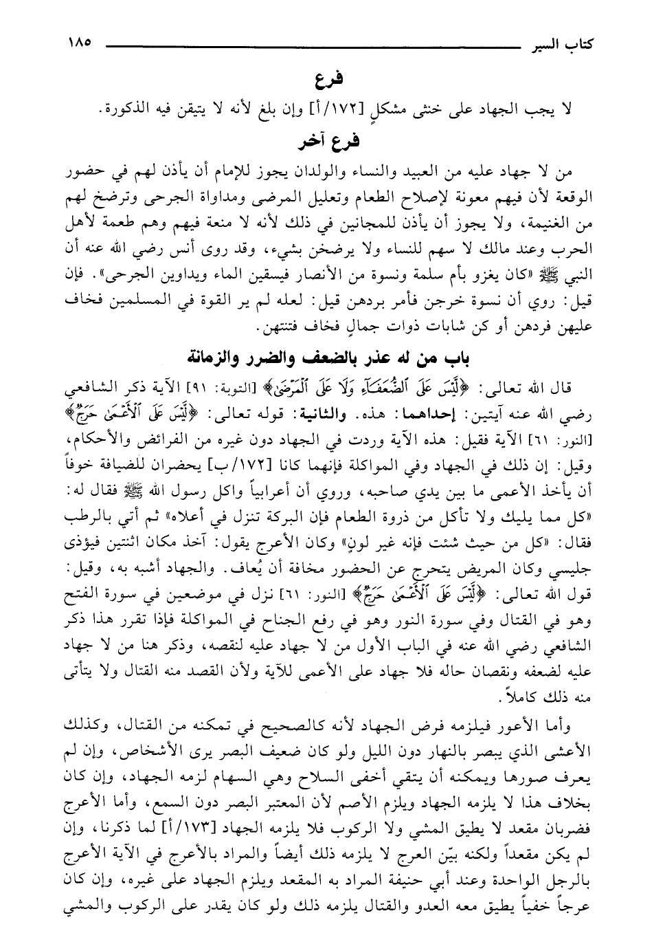 وأما الأعور فيلزمه فرض الجهاد لأنه كالصحيح في تمكنه من القتال، وكذلك الأعشى الذي يبصر بالنهار دون الليل ولو كان ضعيف البصر يرى الأشخاص، وإن لم يعرف صورها ويمكنه أن يتقي أخفى السلاح وهي السهام لزمه الجهاد، وإن كان بخلاف هذا لا يلزمه الجهاد ويلزم الأصم لأن معتبر البصر دون السمع، وأما الأعرج فضربان مقعد لا يطيق المشي ولا الركوب فلا يلزمه الجهاد [173/أ] لما ذكرنا، وإن لم يكن مقعداً ولكنه بيّن العرج لا يلزمه ذلك أيضًا والمراد بالأعرج في الآية الأعرج بالرجل الواحدة وعند أبي حنيفة المراد به المقعد ويلزم الجهاد على غيره، وإن كان عرجًا خفيًا يطيق معه العدو والقتال يلزمه ذلك ولو كان يقدر على الركوب والمشي