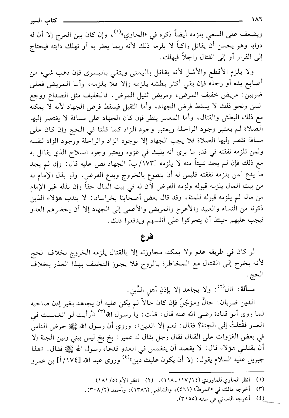 ولا يلزم الأقطع والأشل لأنه يقاتل باليمنى ويتقي باليسرى فإن ذهب شيء من أصابع يده أو رجله فإن بقي أكثر بطشه يلزمه وإلا فلا يلزمه، وأما المريض فعلى ضربين: مريض خفيف المرض، ومريض ثقيل المرض، فالخفيف مثل الصداع ووجع السن ونحو ذلك لا يسقط فرض الجهاد، وأما الثقيل فيسقط فرض الجهاد لأنه لا يمكنه مع ذلك البطش والقتال، وأما المعسر ينظر فإن كان الجهاد على مسافة لا يقتصر إليها الصلاة لم يعتبر وجود الراحلة ويعتبر وجود الزاد كما قلنا في الحج وإن كان على مسافة تقصر إليها الصلاة فلا يجب الجهاد إلا بوجود الزاد والراحلة ووجود الزاد لنفسه ولمن تلزمه نفقته في قدر ما يرى أنه يلبث في غزوه ويعتبر وجود السلاح الذي يقاتل به مع ذلك فإن لم يجد شيئًا منه لا يلزمه [173/ب] الجهاد نص عليه قال: وإن لم يجد ما يدع لمن يلزمه قبوله ولزمه الفرض لأن له في بيت المال حقًا وإن بذله غير الإمام من ماله لم يلزمه قبوله للمنة، وقد قال بعض أصحابنا بخراسان: لا يندب هؤلاء الذين ذكرنا من النساء والعبيد والأعرج والمريض والأعمى إلى الجهاد إلا أن يحضرهم العدو فيجب عليهم حينئذ أن يتحركوا على أنفسهم ويدفعوا ذلك.