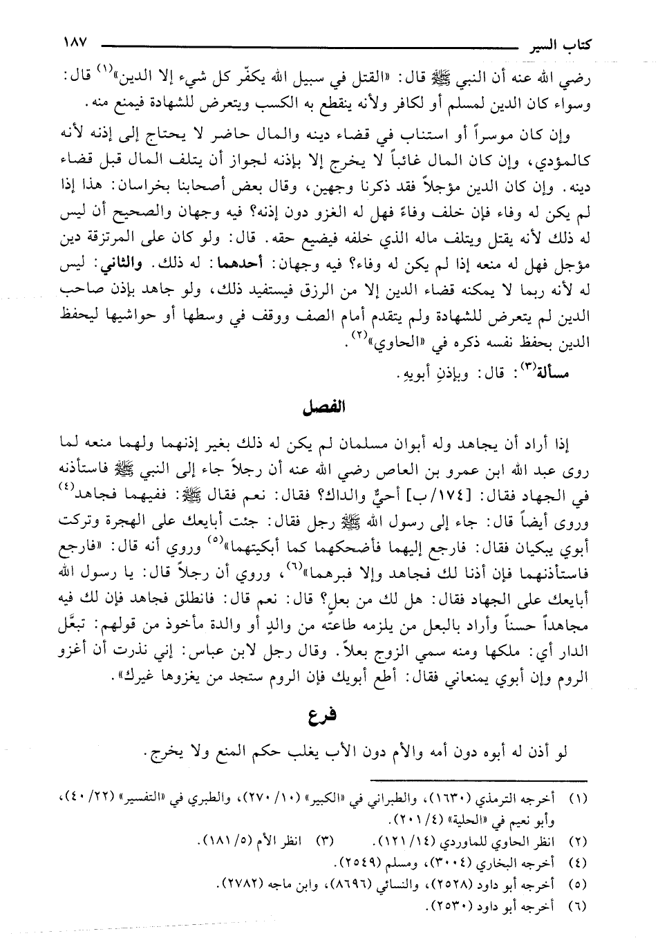 إذا أراد أن يجاهد وله أبوان مسلمان لم يكن له ذلك بغير إذنهما ولهما منعه لما روى علد الله ابن عمرو بن العاص رضي الله عنه أن رجلًا جاء إلى النبي صلى الله عليه وسلم فاستأذنه في الجهاد فقال: [174/ب] أحيٌّ والداك؟ فقال: نعم فقال صلى الله عليه وسلم: ففيهما فجاهد وروى أيضًا قال: جاء إلى رسول الله صلى الله عليه وسلم رجل فقال: جئت أبايعك على الهجرة وتركت أوي يبكيان فقال: فارجع إليهما فأضحكهما كما أبكيتهما)) وروي أنه قال: ((فأرجع فاستأذنهما فإن أذنا لك فجاهد وإلا فبرهما))، وروي أن رجلًا قال: يا رسول الله أبايعك على الجهاد فقال هل لك من بعل؟ قال: نعم قال: فانطلق فجاهد فإن لك فيه مجاهدًا حسنًا وأراد بالبعل من يلزمه طاعته من والدٍ أو والدة مأخوذ من قولهم: تبعَّل الدار أي: ملكها ومنه سمي الزوج بعلًا. وقال رجل لابن عباس: إني نذرت أن أغزو الروم وإن أبوي يمنعاني فقال: أطع أبويك فإن الروم ستجد من يغزوها غيرك)).