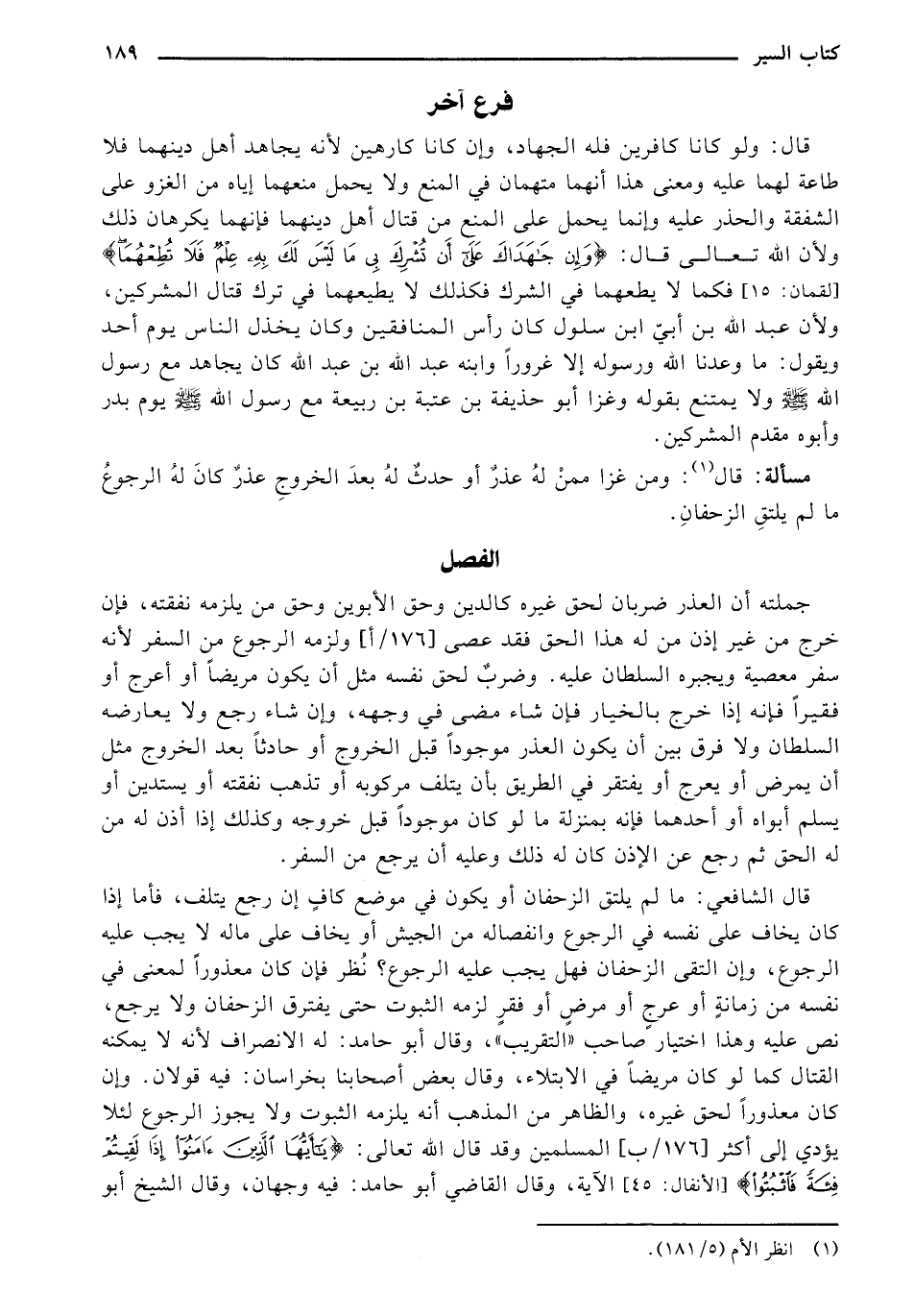 قال الشافعي: ما لم يلتق الزحفان أو يكون في موضع كافٍ إن رجع يتلف، فأما إذا كان يخاف على نفسه في الرجوع وانفصاله من الجيش أو يخاف على ماله لا يجب عليه الرجوع، وإن التقى الزحفان فهل يجب عليه الرجوع؟ نُظر فإن كان معذورًا لمعنى في نفسه من زمانةٍ أو عرجٍ أو مرضٍ أو فقرٍ لزمه الثبوت حتى يفترق الزحفان ولا يرجع، نص عليه وهذا اختيار صاحب ((التقريب))، وقال أبو حامد: له الانصراف لأنه لا يمكنه القتال كما لو مريضًا في الابتلاء، وقال بعض أصحابنا بخراسان: فيه قولان. وإن كان معذورًا لحق غيره، والظاهر من المذهب أنه يلزمه الثبوت ولا يجوز الرجوع لئلا يؤدي إلى أكثر [176/ب] المسلمين وقد قال الله تعالى: {يَا أَيُّهَا الَّذِينَ آَمَنُوا إِذَا لَقِيتُمْ فِئَةً فَاثْبُتُوا} [الأنفال: 45] الآية، وقال القاضي أبو حامد: فيه وجهان، وقال الشيخ أبو