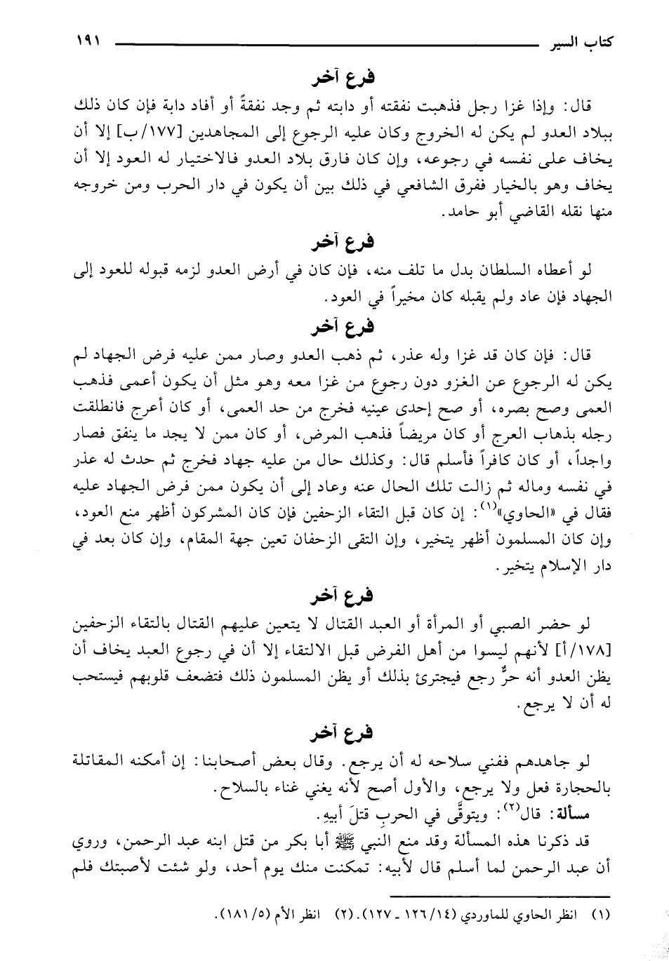 قال: وإذا غزا رجل فذهبت نفقته أو دابته ثم وجد نفقة أو أفاد دابة فإن كان كذلك ببلاد العدو لم يكن له الخروج وكان عليه الرجوع إلى المجاهدين [177/ب] إلا أن يخاف على نفسه في رجوع، وإن كان فارق بلاد العدو فالاختيار له العود إلا أن يخاف وهو بالخيار ففرق الشافعي في ذلك بين أن يكون في دار الحرب ومن خروجه منها نقله القاضي أبو حامد.