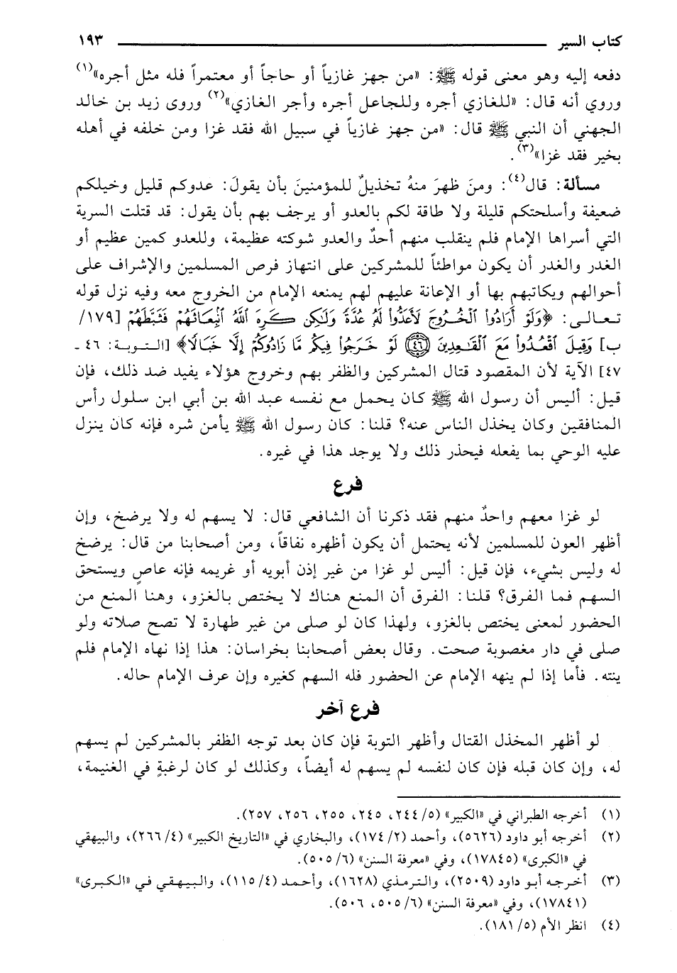 مسألة: قال: ومن ظهر منه تخذيل للمؤمنين بأن يقول: عدوكم قليل وخيلكم التي أسراها الإمام فلم ينقلب منهم أحد والعدو شوكته عظيمة، وللعدو كمين عظيم أو الغدر والغدر أن يكون مواطئا للمشركين علي انتهاز فرص المسلمين والإشراف علي أحوالهم ويكاتبهم بها أو الإعانة عليهم لهم يمنعه الإمام من الخروج معه وفيه نزل قوله تعالي: {ولَوْ أَرَادُوا الخُرُوجَ لأَعَدُّوا لَهُ عُدَّةً ولَكِن كَرِهَ اللَّهُ انبِعَاثَهُمْ فَثَبَّطَهُمْ وقِيلَ اقْعُدُوا مَعَ القَاعِدِينَ (46) لَوْ خَرَجُوا فِيكُم مَّا زَادُوكُمْ إلاَّ خَبَالاً} [التوبة: 46 - 47] الآية لأن المقصود قتال المشركين والظفر بهم وخروج هؤلاء يفيد ضد ذلك، فإن قيل: أليس أن رسول الله صلي الله عليه وسلم كان يحمل مع نفسه عبد الله بن أبي ابن سلول رأس المنافقين وكان يخذل الناس عنه؟ قلنا: كان رسول الله صلي الله عليه وسلم يأمن شره فإنه كان يمزل عليه الوحي بما يفعله فيحذر ذلك ولا يوجد هذا في غيره.
