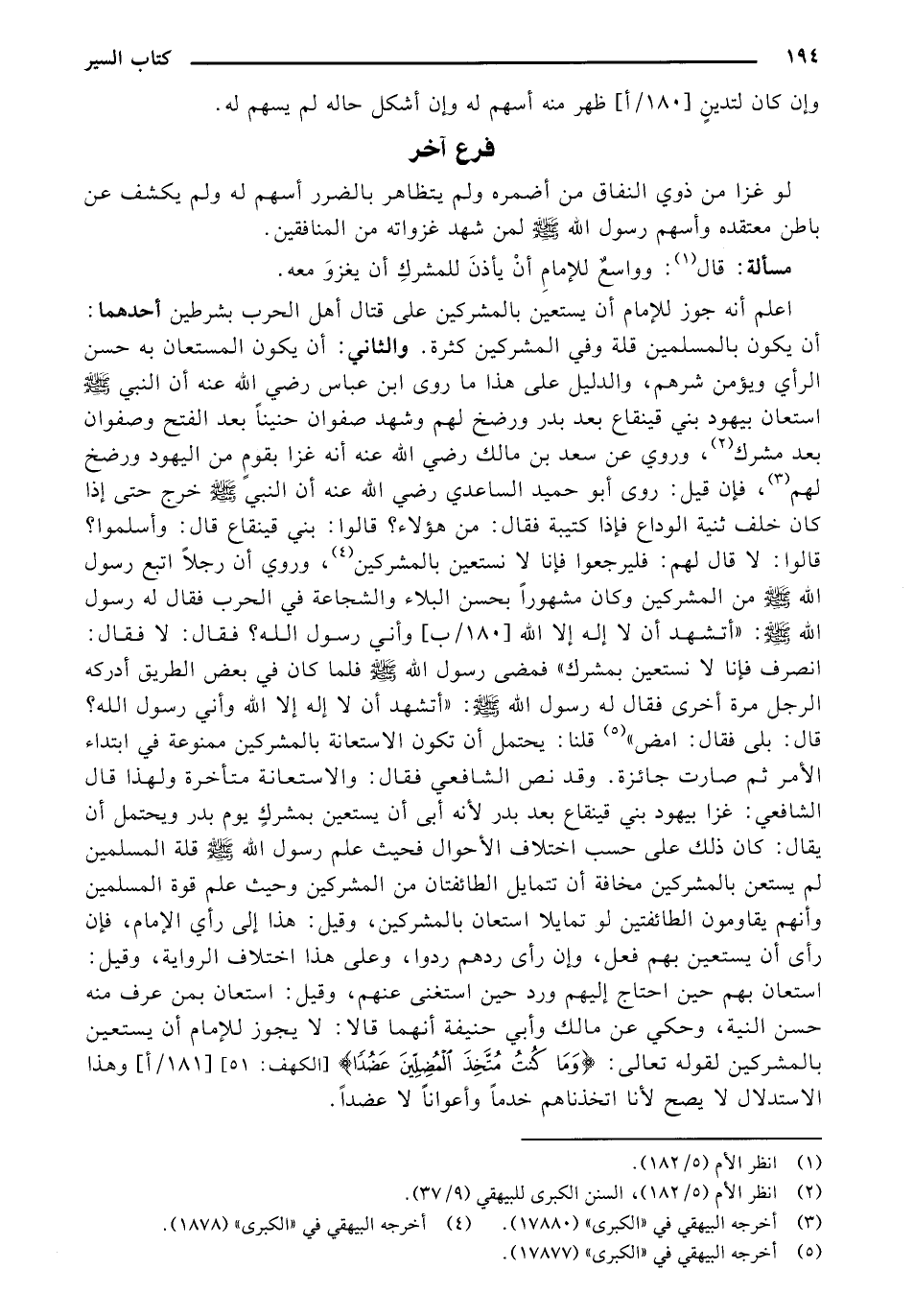 اعلم أنه جوز للإمام أن يستعين بالمشركين على قتال أهل الحرب بشرطين أحدهما: أن يكون بالمسلمين قلة وفي المشركين كثرة. والثاني: أن يكون المستعان به حسن الرأي ويؤمن شرهم، والدليل على هذا ما روي ابن عباس رضي الله عنه أن النبي صلي الله عليه وسلم استعان بيهود بني قينقاع بعد بدر ورضخ لهم وشهد صفوان حنينا بعد الفتح وصفوان بعد مشرك، وروي عن سعد بن مالك رضي الله عنه أنه غزا بقوم من اليهود ورضخ لهم، فإن قيل: روي أبو حميد الساعدي رضي الله عنه أن النبي صلي الله عليه وسلم خرج حتى إذا كان خلف ثنية الوداع فإذا كتيبة فقال: من هؤلاء؟ قالوا: بني قينقاع قال: وأسلموا؟ قالوا: لا قال لهم: فليرجعوا فإنا لا نستعين بالمشركين، وروي أن رجلا اتبع رسول الله صلي الله عليه وسلم من المشركين وكان مشهورا بحسن البلاء والشجاعة في الحرب فقال له رسول الله صلي الله عليه وسلم: ((أتشهد أن لا إله إلا الله [180/ب] وأني رسول الله؟ فقال: لا فقال: انصرف فإنا لا نستعين بمشرك)) فمضي رسول الله صلي الله عليه وسلم فلما كان في بعض الطريق أدركه الرجل مرة أخري فقال له رسول الله صلي الله عليه وسلم: ((أتشهد أن لا إله إلا الله وأني رسول الله؟ قال: بلي فقال: امض)) قلنا: يحتمل أن تكون الاستعانة بالمشركين ممنوعة في ابتداء الأمر ثم صارت جائزة. وقد نص الشافعي فقال: والاستعانة متأخرة ولهذا قال الشافعي: غزا بيهود بني قينقاع بعد بدر لأنه أبي أن يستعين بمشرك يوم بدر ويحتمل أن يقال: كان ذلك على حسب اختلاف الأحوال فحيث علم رسول الله صلي الله عليه وسلم قلة المسلمين لم يستعن بالمشركين مخافة أن تتمايل الطائفتان من المشركين وحيث علم قوة المسلمين وأنهم يقاومون الطائفتين لو تمايلا استعان بالمشركين، وقيل: هذا إلى رأي الإمام، فإن رأي أن يستعين بهم فعل، وإن رأي ردهم ردوا، وعلى هذا اختلاف الرواية، وقيل: استعان بهم حين احتاج إليهم ورد حين استغني عنهم، وقيل: استعان بمن عرف منه حسن النية، وحكي عن مالك وأبي حنيفة أنهما قالا: لا يجوز للإمام أن يستعين بالمشركين لقوله تعالى: {وَمَا كُنتُ مُتَّخِذَ المُضِلِّينَ عَضُداً} [الكهف: 51] [181/أ] وهذا الاستدلال لا يصح لأنا اتخذناهم خدما وأعوانا لا عضدا.
