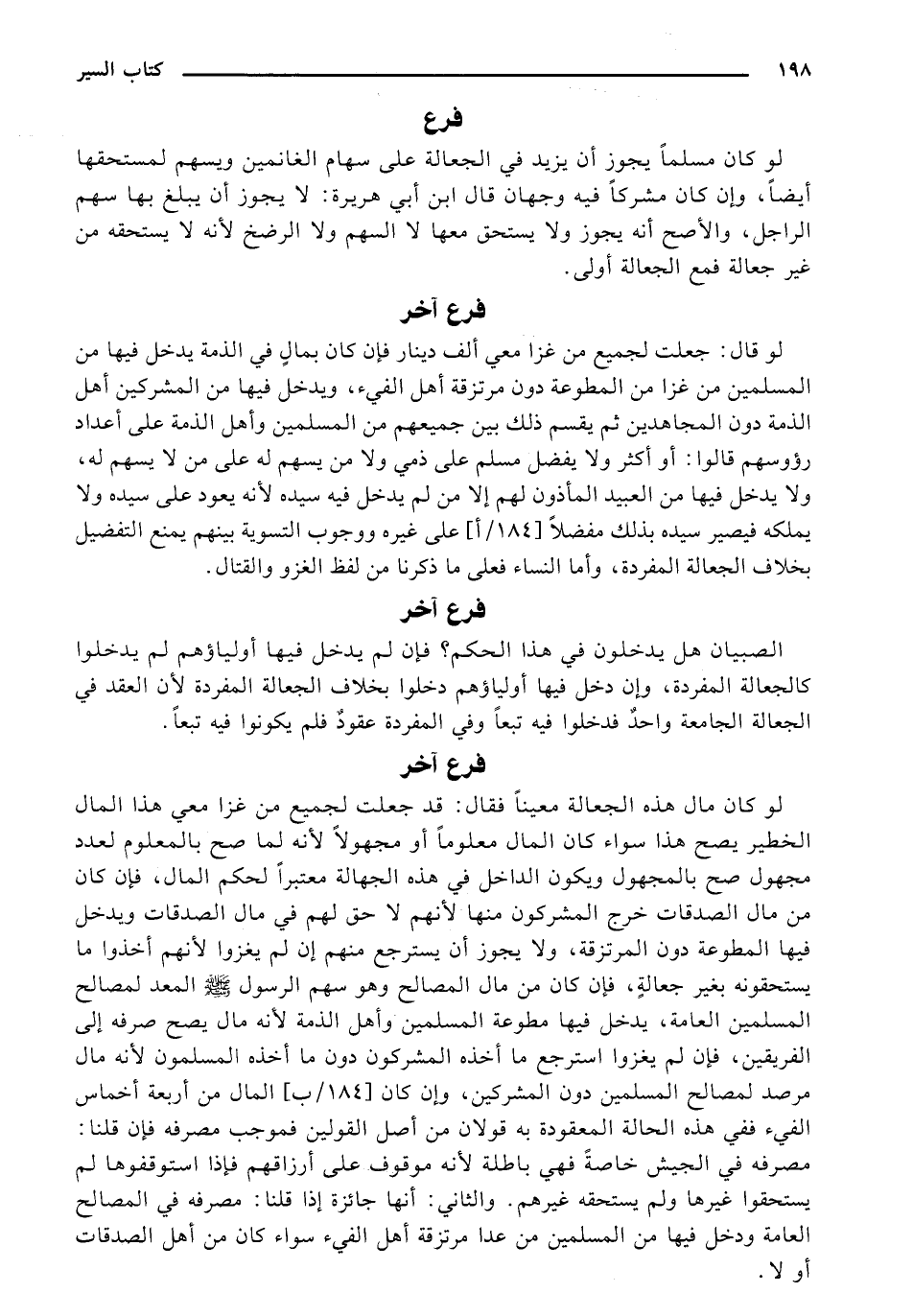 لو قال: جعلت لجميع من غزا معي ألف دينار فإن كان بمال في الذمة يدخل فيها من المسلمين من غزا من المطوعة دون مرتزقة أهل الفئ، ويدخل فيها من المشركين أهل الذمة دون المجاهدين ثم يقسم ذلك بين جميعهم من المسلمين وأهل الذمة على أعداد رؤوسهم قالوا: أو أكثر ولا يفضل مسلم على ذمي ولا من يسهم له على من لا يسهم له، ولا يدخل فيها من العبيد المأذون لهم إلا من لم يدخل فيه سيده لأنه يعود على سيده ولا يملكه فيصير سيده بذلك مفضلا [184/أ] على غيره ووجوب التسوية بينهم يمنع التفضيل بخلاف الجعالة المفردة، وأما النساء فعلي ما ذكرنا من لفظ الغزو والقتال.