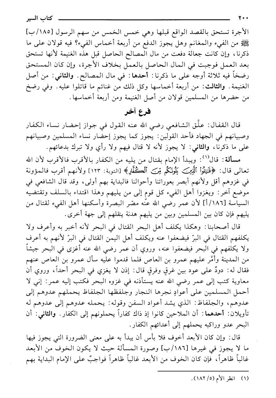 مسألة: قال: ويبدأ الإمام بقتال من يليه من الكفار بالأقرب فالأقرب لأن الله تعالي قال: {قَاتِلُوا الَّذِينَ يَلُونَكُم مِّنَ الكُفَّارِ} ولأنهم أقرب فالمؤونة في غزوهم أقل ولأنهم أبصر بعوراتنا وأحوالنا فالبداية بهم أولي، وقد قال الشافعي في موضع آخر: ويغزوا أهل الفيء كل قوم إلي من يليهم وهذا اقتداء بالسلف وتقتضيه السياسة لأن عمر رضي الله عنه مصر البصرة وأسكنها أهل الفيء لقتال من يليهم فإن كان بين المسلمين وبين من يليهم هدنة ينقلهم إلي جهة أخري.