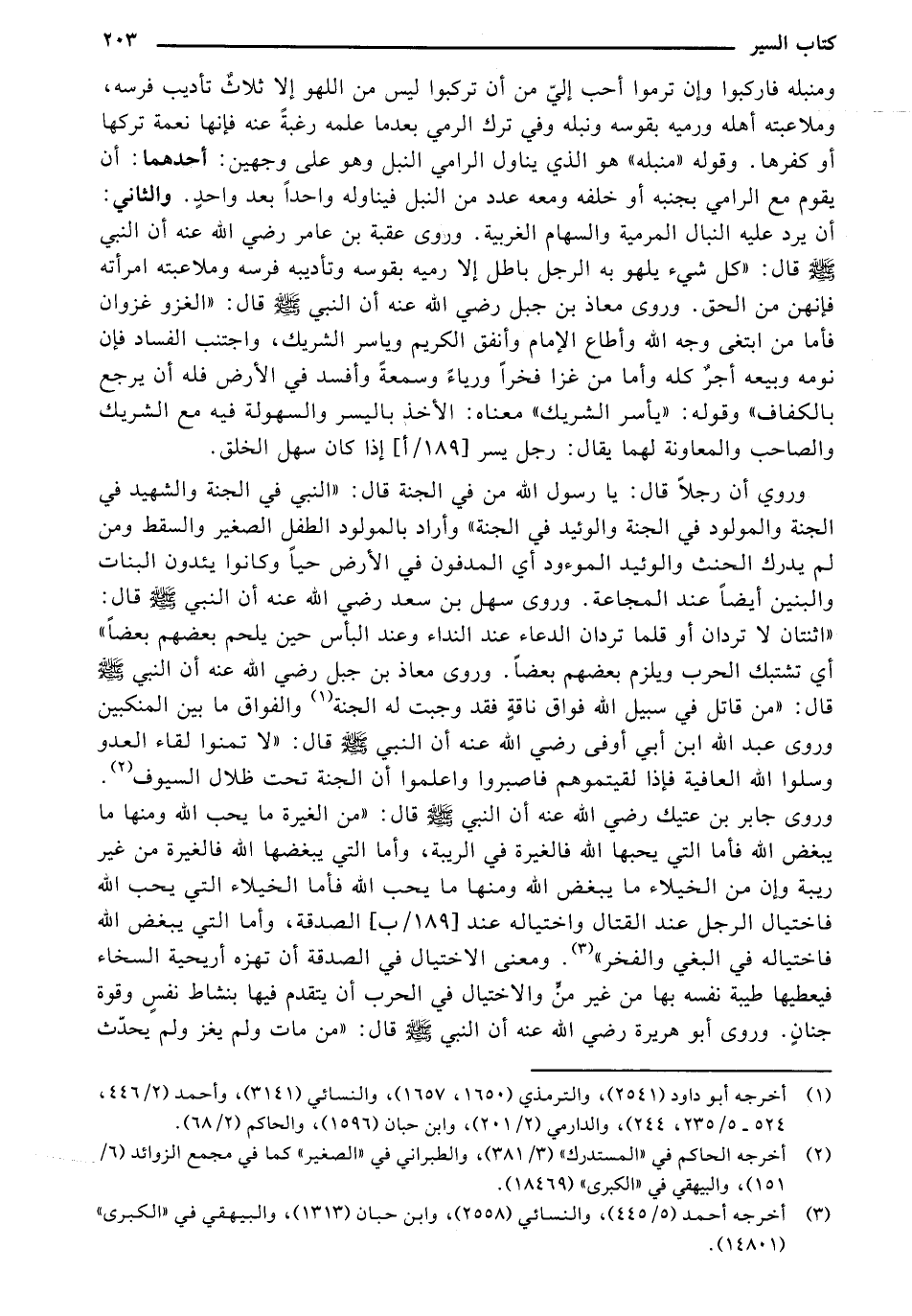 وروي أن رجلًا قال: يا رسول الله من في الجنة قال: "النبي في الجنة والشهيد في الجنة والمولود في الجنة والوئيد في الجنة" وأراد بالمولود الطفل الصغير والسقط ومن لم يدرك الحنث، والوئيد الموءود أي المدفون في الأرض حيًا وكانوا يؤدون البنات والبنين أيضًا عند المجاعة. وروى سهل بن سعد رضي الله عنه أن النبي صلى الله عليه وسلم قال: "اثنتان لا تردان أو قلما تردان الدعاء عند النداء وعند البأس حين يلحم بعضهم بعضًا" أي تشتبك الحرب ويلزم بعضهم بعضًا. وروى معاذ بن جبل رضي الله عنه أن النبي صلى الله عليه وسلم قال: "من قاتل في سبيل الله فواق ناقة فقد وجبت له الجنة والفواق ما بين المنكبين وروى عبد الله ابن أبي أوفى رضي الله عنه أن النبي صلى الله عليه وسلم قال: "لا تمنوا لقاء العدو وسلوا الله العافية فإذا لقيتموهم فاصبروا واعلموا أن الجنة تحت ظلال السيوف". وروى جابر بن عتيق رضي الله عنه أن النبي صلى الله عليه وسلم قال: "من الغيرة ما يحب الله ومنها ما يبغض الله فأما التي يحبها الله فالغيرة في الريبة، وأما التي يبغضها الله فالغيرة من غير ريبة وإن من الخيلاء ما يبغض الله ومنها ما يحب الله فأما الخيلاء التي يحب الله فاختيال الرجل عند القتال واختياله عند الصدقة، وأما التي يبغض الله فاختياله في البغي والفخر". ومعنى الاختيال في الصدقة أن تهزه أريحية السخاء فيعطيها طيبة نفسه بها من غير من والاختيال في الحرب أن يتقدم فيها بنشاط نفس وقوة جنان. وروى أبو هريرة رضي الله عنه أن النبي صلى الله عليه وسلم قال: "من مات ولم يغز ولم يحدث