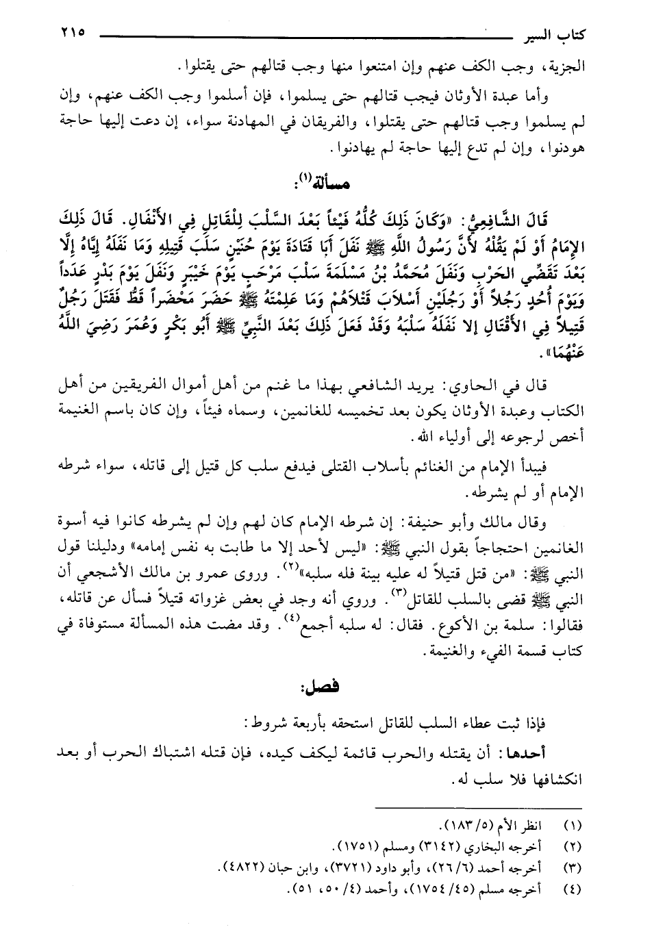 وقال مالك وأبو حنيفة: إن شرطه الإمام كان لهم وإن لم يشترطه كانوا فيه أسوة الغانمين احتجاجًا بقول النبي صلى الله عليه وسلم: "ليس لأحد ما طابت به نفس إمامه" ودليلنا قول النبي صلى الله عليه وسلم: "من قتل قتيلًا له عليه بينة فله سلبه". وروى عمرو بن مالك الأشجع أن النبي صلى الله عليه وسلم قضى بالسلب للقاتل. وروي أنه وجد في بعض غزواته قتيلًا فسأله عنه قاتله، فقالوا: سلمه بن الأكوع. فقال: له سلبه أجمع. وقدا مضت هذه المسألة مستوفاة في كتاب قسمة الفيء والغنيمة.
