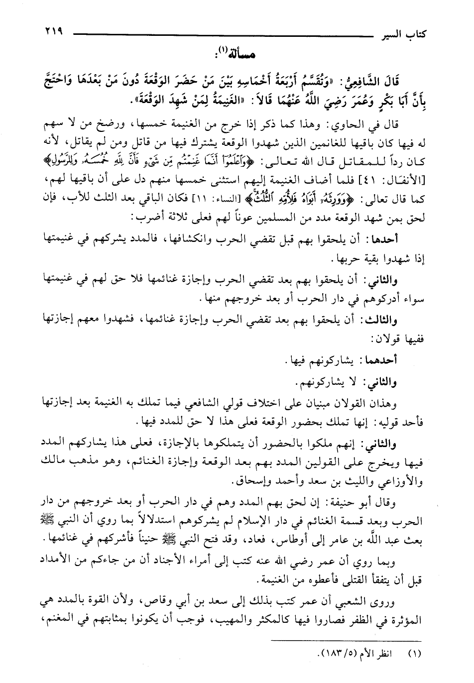 قال الشافعي: "وتقسم أربعة أخماسه بين من حضر الوقعة دون من بعدها واحتج بأن أبا بكر وعمر رضي الله عنهما قالا: "الغنيمة لمن شهد الوقعة".