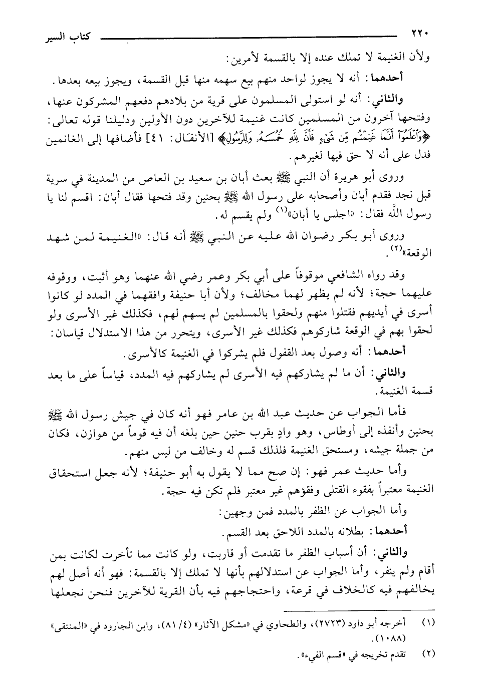 والثاني: أن أسباب الظفر ما تقدمت أو قاربت، ولو كانت مما تأخرت لكانت بمن أقام ولم ينفر، وأما الجواب عن استدلالهم بأنها لا تملك إلا بالقسمة: فهو أن أصل لهم يخالفهم فيه كالخلاف في قرعة، واحتجاجهم فيه بأن القرى للآخرين فنحن نجعلها