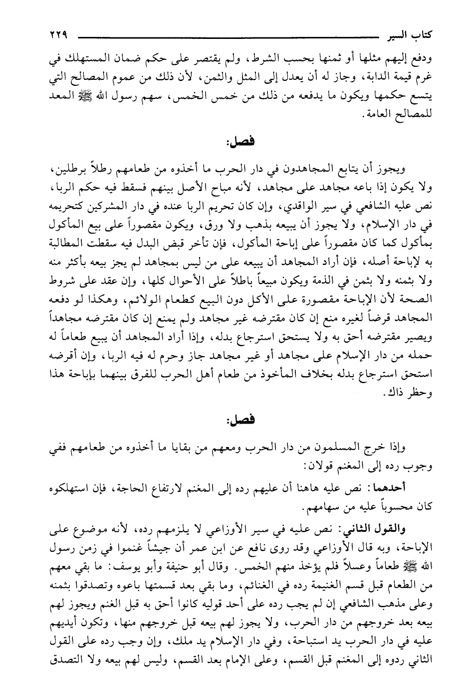 ودفع إليهم مثلها أو ثمنها بحسب الشرط، ولم يقتصر على حكم ضمان المستهلك في غرم قيمة الدابة، وجاز أن يعدل إلي المثل والثمن، لأن ذلك من عموم المصالح التي يتسع حكمها ويكون ما يدفعه من ذلك من خمس الخمس، سهم رسول الله صلى الله عليه وسلم المعد للمصالح العامة.