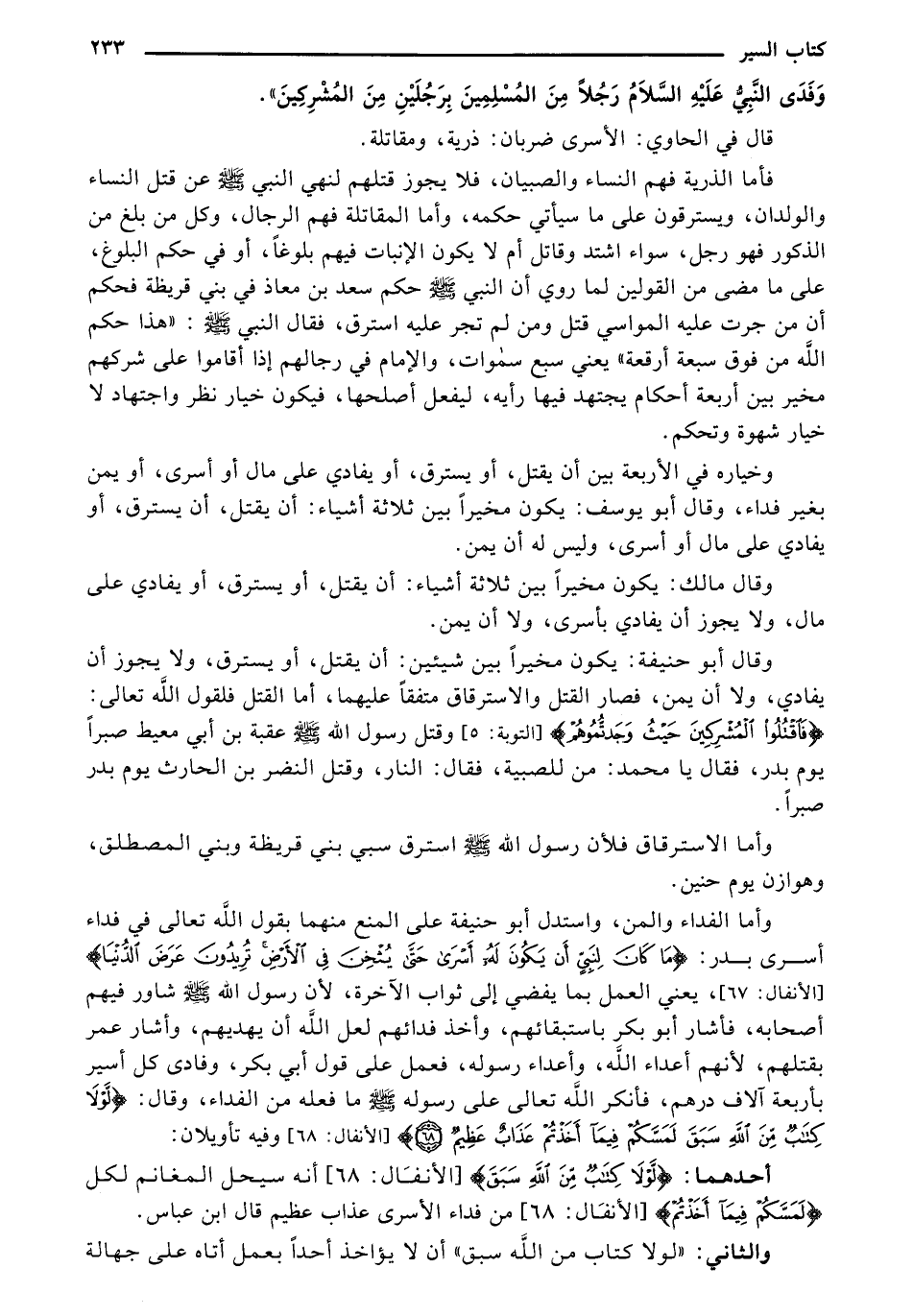 وأما الاسترقاق فلأن رسول الله صلى الله عليه وسلم استرق سبي بني قريظة وبني المصطلق، وهوازن يوم حنين. وأما الفداء والمن، واستدل أبو حنيفة على المنع منهما بقول الله تعالى في فداء أسرى بدر: {مَا كَانَ لِنَبِيٍّ أَن يَكُونَ لَهُ أَسْرَى حَتَّى يُثْخِنَ فِي الأَرْضِ تُرِيدُونَ عَرَضَ الدُّنْيَا}، يعني العمل بما يفضي إلي ثواب الآخرة، لأن رسول الله صلى الله عليه وسلم شاور فيهم أصحابه، فأشار أبو بكر باستبقائهم، وأخذ فدائهم لهل الله أن يهديهم، وأشار عمر بقتلهم، لأنهم أعداء الله، وأعداء رسوله، فعمل على قول أبي بكر، وفادى كل أسير بأربعة آلاف درهم، فأنكر الله تعالى على رسوله صلى الله عليه وسلم ما فعله من الفداء، وقال: {لَوْلا كِتَابٌ مِّنَ اللَّهِ سَبَقَ لَمَسَّكُمْ فِيمَا أَخَذْتُمْ عَذَابٌ عَظِيمٌ} وفيه تأويلان:
