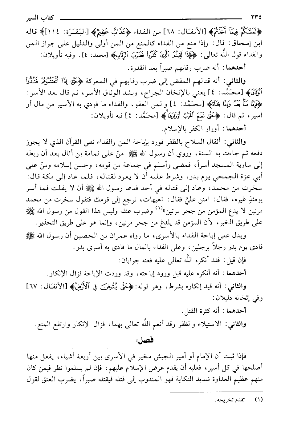 والثاني: أثقال السلاح بالظفر فورد بإباحة المن والفداء نص القرآن الذي لا يجوز دفعه ثم جاءت به السنة، وروي أن رسول الله صلى الله عليه وسلم من على ثمامة بن أثال بعد أن ربطه إلي سارية المسجد أسرًا، فمضى وأسلم في جماعة من قومه، وحسن إسلامه ومن على أبي عزة الجمحي يوم بدر، وشرط عليه أن لا يعود لقتاله، فلما عاد إلي مكة قال: سخرت من محمد، وعاد إلي قتاله في أحد فدعا رسول الله صلى الله عليه وسلم أن لا يلفت فما أسر يومئذ غيره، فقال: امنن علي فقال: "هيهات، ترجع إلي قومك فتقول سخرت من محمد مرتين لا يدع المؤمن من حجر مرتين" وضرب عنقه وليس هذا القول من رسول الله صلى الله عليه وسلم على طريق الخبر، لأن المؤمن قد يلدغ من جحر مرتين، وإنما هو على طريق التحذير.