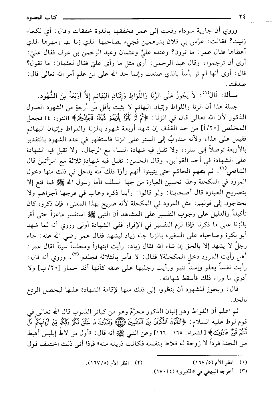 جملة هذا أن الزنا واللواط وإتيان البهائم لا يثبت بأقل من أربعة من الشهود العدول الذكور لأن الله تعالى قال في الزنا: {ثُمَّ لَمْ يَاتُوا بِأَرْبَعَةِ شُهَدَاءَ فَاجْلِدُوهُمْ} [النور:4] فجعل المخلص [20/أ] من حد القذف إن شهد أربعة شهود بالزنا واللواط وإتيان البهائم فقيس على هذا، ولأنه مندوبٌ إلى الستر على الزنا فاستظهر في عدد الشهود بالتقدير بالأربعة توصلًا إلى ستره، ولا تقبل فيه شهادة النساء مع الرجال، ولا تقبل فيه الشهادة على الشهادة في أحد القولين، وقال الحسن: تقبل فيه شهادة ثلاثة مع امرأتين قال الشافعي: ثم يتفهم الحاكم حتى يتبينوا أنهم رأوا ذلك منه يدخل في ذلك منها دخول المرود في المكحلة وهذا تحسين العبارة من جهة السلف فأما رسول الله صلى الله عليه وسلم فما قنع إلا بتصريح العبارة قال أصحابنا: ولو قالوا: رأينا ذكره وغاب في فرجها أجزاهم ولا يحتاجون إلي قولهم: مثل المرود في المكحلة لأنه صريح بهذا المعنى، فإن ذكروه كان تأكيدًا والدليل على وجوب التفسير على المشاهد أن النبي صلى الله عليه وسلم استفسر ماعزًا حتى أقر بالزنا على ما ذكرنا فإذا لزم التفسير في الإقرار ففي الشهادة أولى وروي أنه لما شهد أبو بكرة وصاحباه على المغيرة بالزنا جاء زياد ليشهد فقال عمر رضي الله عنه: جاء رجلٌ لا يشهد إلا بالحق إن شاء الله فقال زياد: رأيت ابتهارًا ومجلسًا سيئًا فقال عمر: أهل رأيت المرود دخل المكحلة؟ فقال: لا فأمر بالثلاثة فجلدوا، وروي أنه قال: رأيت نفسًا يعلو وإستًا تنبو ورأيت رجليها على عنقه كأنها أذنا حمار [20/ب] ولا أدري ما وراء ذلك فأسقط شهادته.
