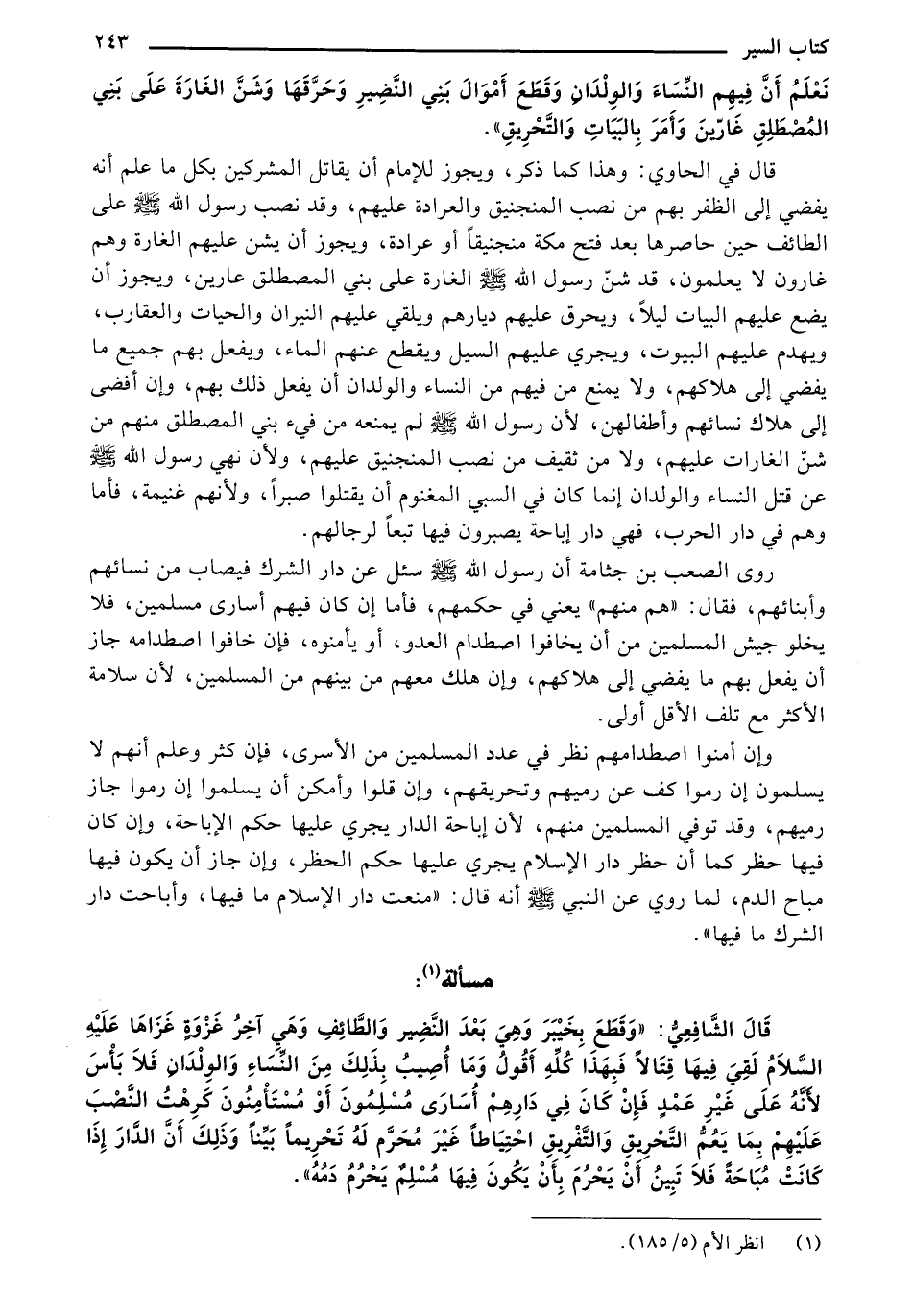 قال الشافعي: "وقطع بخيبر وهي بعد النضير والطائف وهي آخر غزوة غزاها عليه السلام لقي فيها قتالاً فبهذا كله أقول وما أصيب بذلك من النساء والوالدان فلا بأس لأنه على غير عمد فإن كان في دارهم أساري مسلمون أو مستأمنون كرت النصب عليهم بما ينعم التحريق والتفريق احتياطيًا غير محرم له تحريماً بينًا وذلك أن الدار إذا كانت مباحة فلا تبين أن يحرم بأن يكون فيها مسلم يحرم دمه".