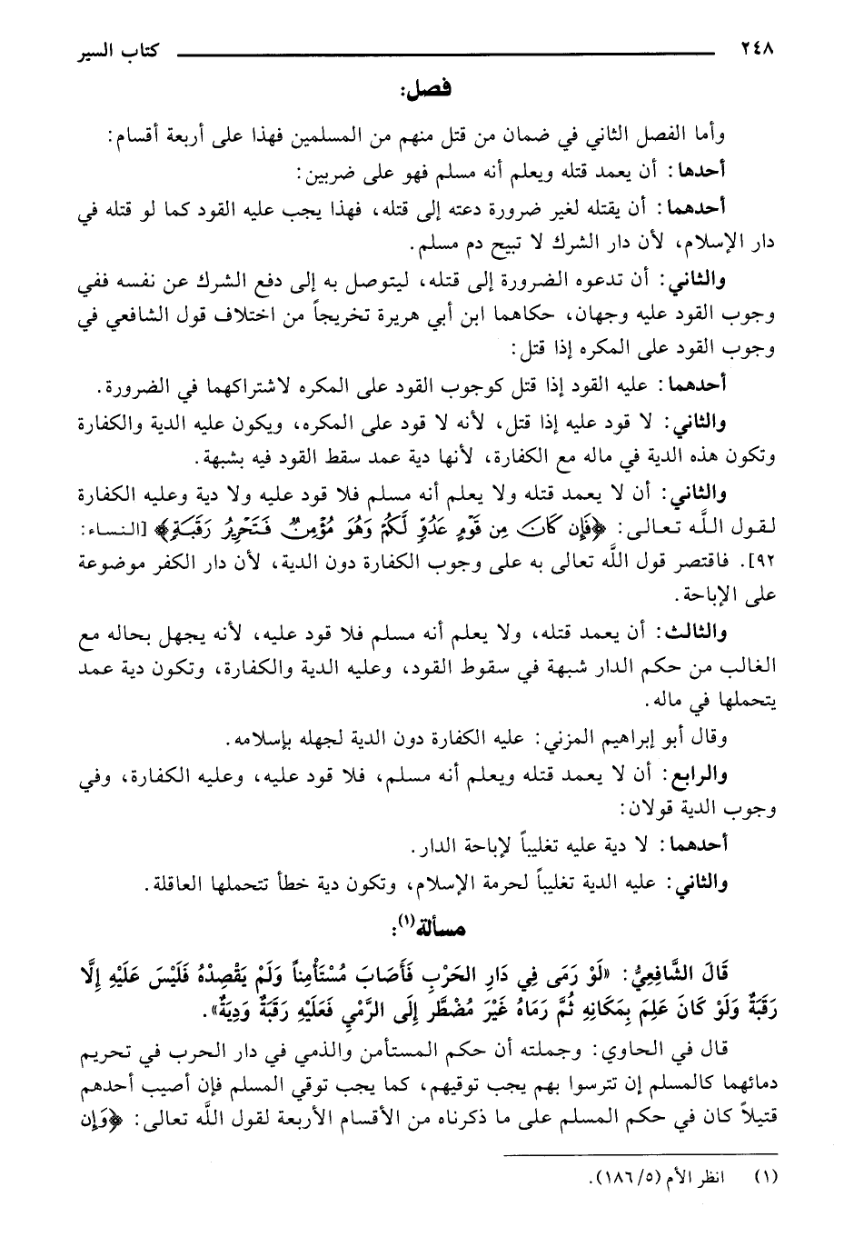 قال الشافعي: "لو رمى في دار الحرب فأصاب مستأمنا ولم يقصده فليس عليه إلا رقبة