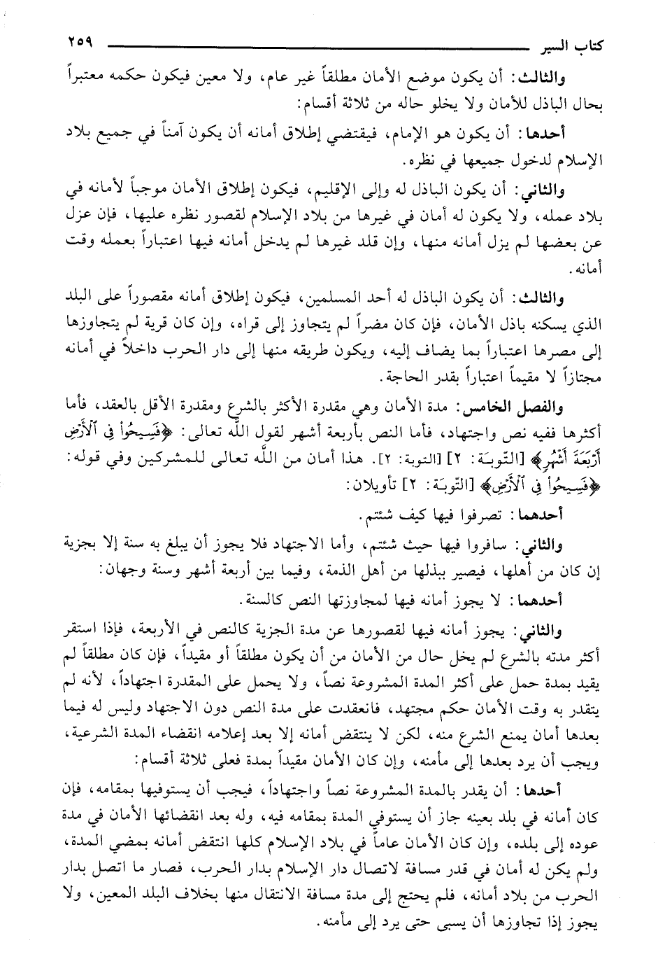 والفصل الخامس: مدة الأمان وهي مقدرة الأكثر بالشرخ ومقدرة الأقل بالعقد، فأما أكثرها ففيه نص واجتهاد، فأما النص بأربعة أشهر لقول الله تعالى: {فَسِيحُوا فِي الأَرْضِ أربعة أَشْهُرٍ}.هذا أمان من الله تعالى للمشركين وفي قوله: {فَسِيحُوا فِي الأَرْضِ} تأويلان:
