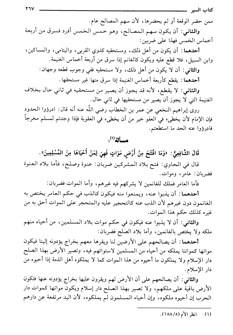 قال الشافعي:" وما افتتح من أرض موات لمن أحياها من المسلمين"