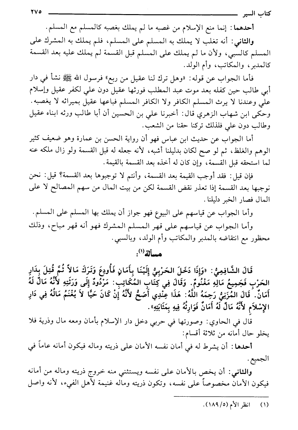 قال الشافعي:" وإذا دخل الحربي إلينا بأمان فأودع وترك مالا ثم قتل بدار الحرب فجميع ماله مغنوم، وقال في كتاب المكاتب: مردود إلى ورثته لأنه مال له أمان. قال المزني رحمه الله: هذا عندي أصح لأنه إن كان حيا لا يغنم ماله في دار الإسلام لأنه مال له أمان فوارثه فيه بمثابته".