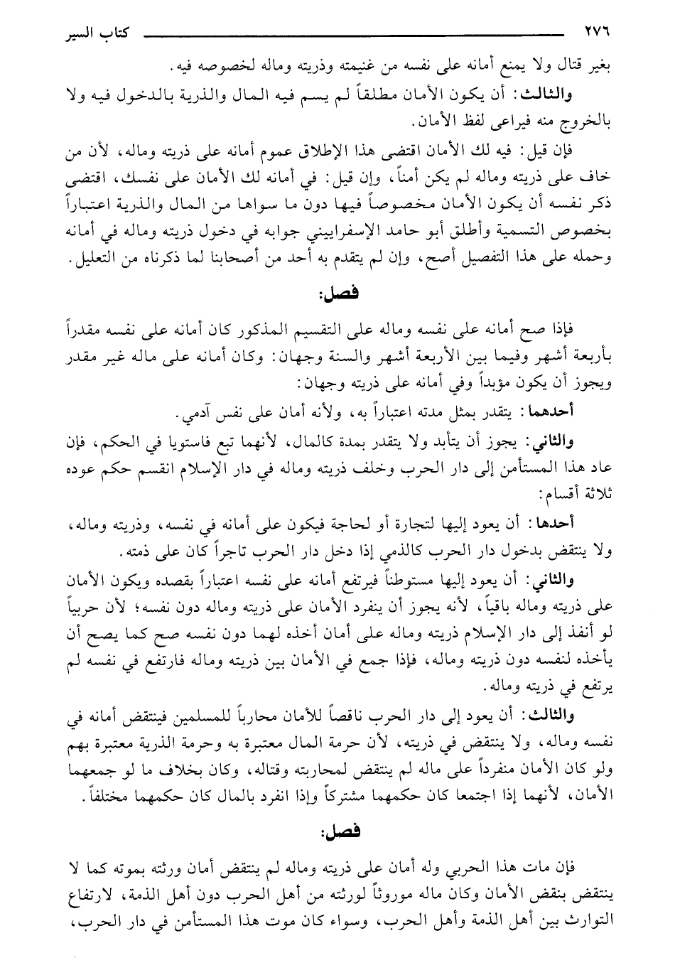 والثالث: أن يعود إلى دار الحرب ناقصاً للأمان محاربًا للمسلمين فينتقض أمانه في نفسه وماله، ولا ينتقض في ذريته، لأن حرمة المال معتبرة به وحرمة الذرية معتبرة بهم ولو كان الأمان منفردًا على ماله لم ينتقض لمحاربته وقتاله، وكان بخلاف ما لو جمعهما الأمان، لأنهما إذا اجتمعنا كان حكمهما مشتركًا وإذا انفرد بالمال كان حكمهما مختلفاً.