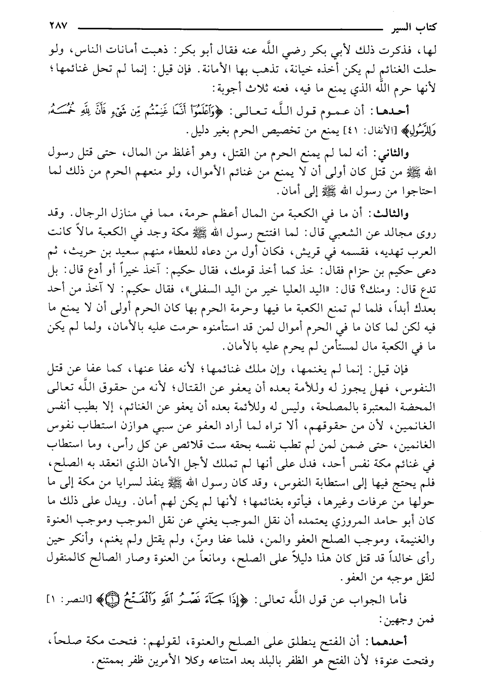 فإن قيل: إنما لم يغنمها، وإن ملك غنائمها؛ لأنه عفا عنها، كما عفا عن قتل النفوس، فهل يجوز له وللأمة بعده أن يعفو عن القتال؛ لأنه من حقوق الله تعالى المحضة المعتبرة بالمصلحة، وليس له وللأئمة بعده أن يعفو عن الغنائم، إلا بطيب أنفس الغانمين، لأن من حقوقهم، ألا تراه لما أراد العفو عن سبي هوازن استطاب نفوس الغانمين، حتى ضمن لمن لم تطب نفسه بحقه ست قلائص عن كل رأس، وما استطاب في غنائم مكة نفس أحد، فدل على أنها لم تملك لأجل الأمان الذي انعقد به الصلح، فلم يحتج فيها إلى استطابة النفوس، وقد كان رسول الله صلى الله عليه وسلم ينفذ لسرايا من مكة إلى ما حولها من عرفات وغيرها، فيأتوه بغنائمها؛ لأنها لم يكن لهم أمان. ويدل على ذلك ما كان أبو حامد المروزي يعتمده أن نقل الموجب يغني عن نقل الموجب وموجب العنوة والغنيمة، وموجب الصلح العفو والمن، فلما عفا ومن، ولم يقتل ولم يغنم، وأنكر حين رأى خالدًا قد قتل كان هذا دليًل على الصلح، ومانعاً من العنوة وصار الصالح كالمنقول لنقل موجبه من العفو.