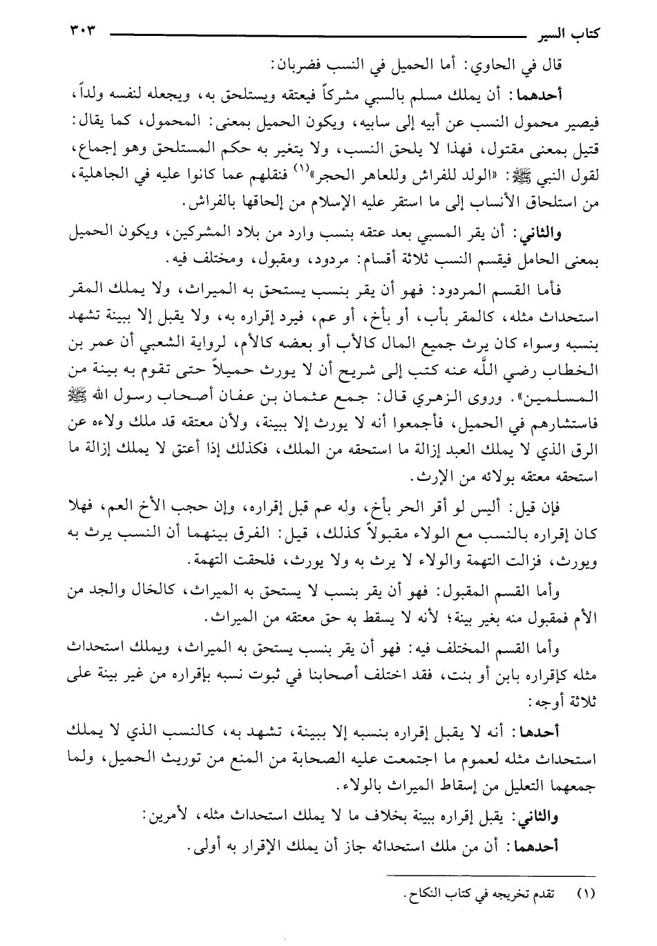 والثاني: أن يقر المسبي بعد عتقه بنسب وارد من بلاد المشركين، ويكون الحميل بمعنى الحامل فيقسم النسب ثلاثة أقسام: مردود، ومقبول، ومختلف فيه.