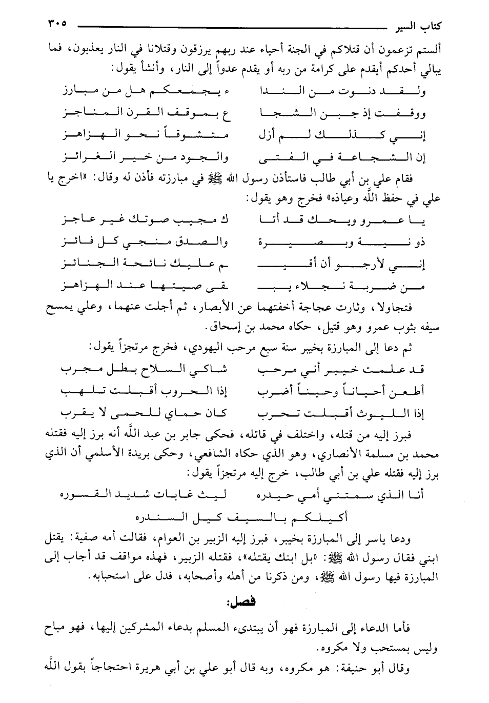 ودعا ياسر إلى المبارزة بخيبر، فبرز إليه الزبير بن العوام، فقالت أمه صفية: يقتل ابني فقال رسول الله صلي الله عليه وسلم: "بل ابنك يقتله" فقتله الزبير، فهذه مواقف قد أجاب إلى المبارزة فيها رسول الله صلي الله عليه وسلم، ومن ذكرنا من أهله وأصحابه، فدل على استحبابه.