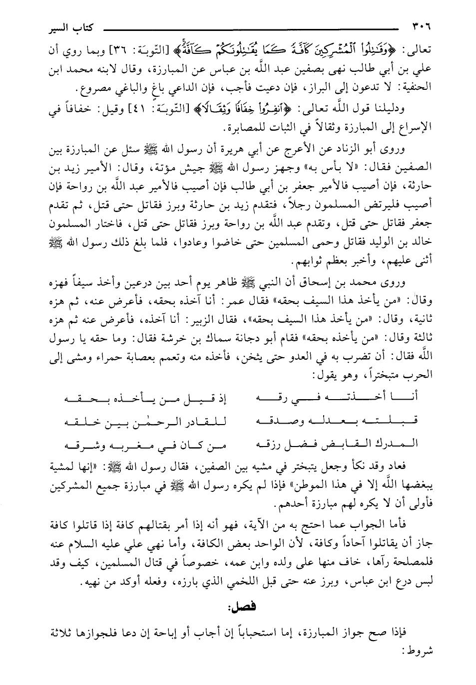 وروى أبو الزناد عن الأعرج عن أبي هريرة أن رسول الله صلي الله عليه وسلم سئل عن المبارزة بين الصفين فقال: "لا بأس به" وجهز رسول الله صلي الله عليه وسلم جيش مؤتة، وقال: الأمير زيد بن حارثة، فإن أصيب فالأمير جعفر بن أبي طالب فإن أصيب فالأمير عبد الله بن رواحة فإن أصيب فليرتض المسلمون رجلًا، فتقدم زيد بن حارثة وبرز فقاتل حتى قتل، ثم تقدم جعفر فقاتل حتى قتل، وتقدم عبد الله بن رواحة وبرز فقاتل حتى قتل، فاختار المسلمون خالد بن الوليد فقاتل وحمي المسلمين حتى خاضوا وعادوا، فلما بلغ ذلك رسول الله صلي الله عليه وسلم أثنى عليهم، وأخبر بعظم ثوابهم.
