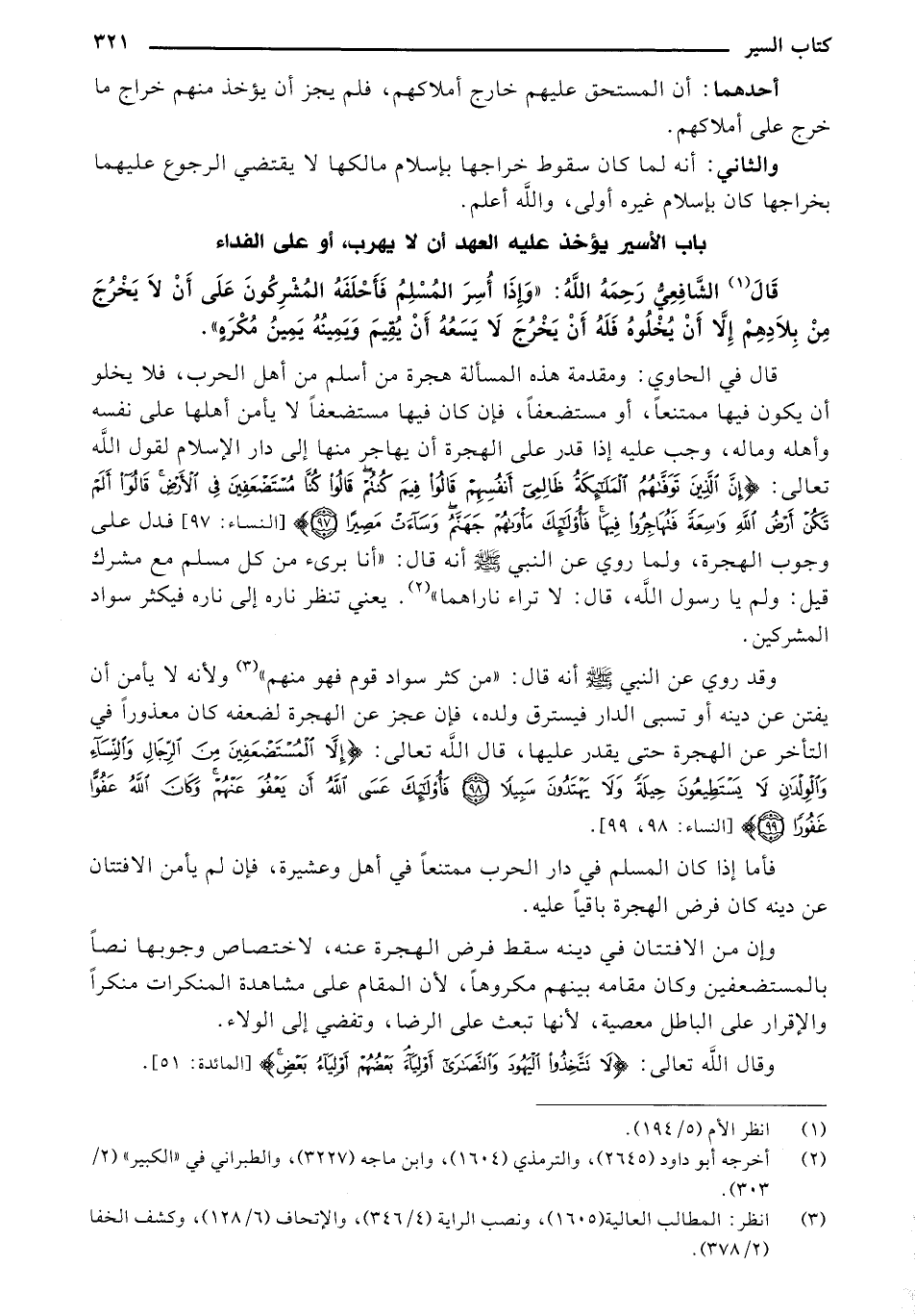 قال في الحاوي: ومقدمة هذه المسألة هجرة من أسلم من أهل الحرب، فلا يخلو أن يكون فيها ممتنعًا أو مستضعفًا، فإن كان فيها مستضعفًا لا يأمن أهلها على نفسه وأهله وماله، وجب عليه إذا قدر على الهجرة أن يهاجر منها إلى دار الإسلام لقول الله تعالى: {إِنَّ الَّذِينَ تَوَفَّاهُمُ الْمَلَائِكَةُ ظَالِمِي أَنفُسِهِمْ قَالُوا فِيمَ كُنتُمْ قَالُوا كُنَّا مُسْتَضْعَفِينَ فِي الْأَرْضِ قَالُوا أَلَمْ تَكُنْ أَرْضُ اللَّهِ وَاسِعَةً فَتُهَاجِرُوا فِيهَا فَأُولَائِكَ مَاوَاهُمْ جَهَنَّمُ وَسَاءَتْ مَصِيرًا} [النساء: 97]. فدل على وجوب الهجرةً، ولما روي عن النبي - صلى الله عليه وسلم- أنه قال: "أنا بريء من كل مسلم مع مشرك قيل: ولم يا رسول الله، قال: لا تراءا ناراهما". يعني تنظر ناره إلى ناره فيكثر سواد المشركين.