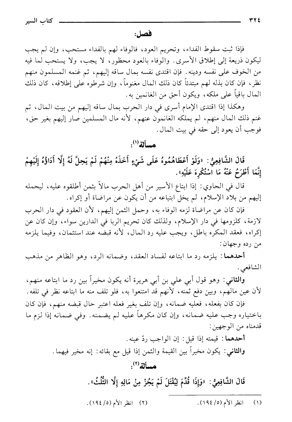 فإذا ثبت سقوط الفداء، وتحريم العود، فالوفاء لهم بالفداء مستحب، وإن لم يجب، ليكون ذريعةً إلى إطلاق الأسرى. والوفاء بالعود محظور، لا يجب، ولا يستحب لما فيه من الخوف على نفسه ودينه. فإن افتدى نفسه بماله ساقه إليهم، ثم غنمه المسلمون منهم نظر، فإن كان بذله لهم مبتدئًا كان ذلك المال مغنومًا، وإن شرطوه على إطلاقه، كان ذلك الحال باقيًا على ملكه، ويكون أحق من الغانمين به.