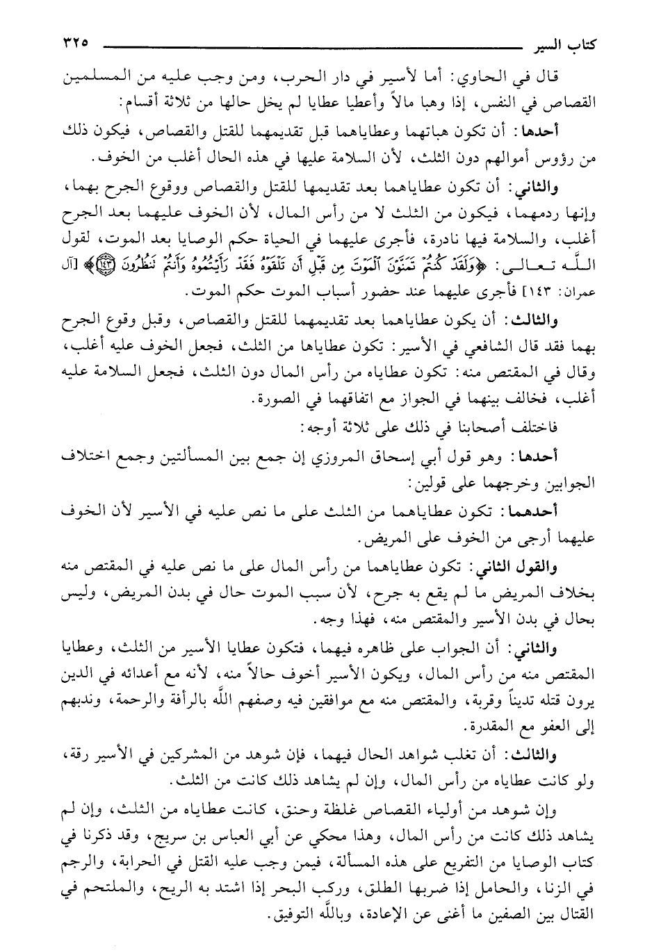 والثاني: أن الجواب على ظاهره فيهما، فتكون عطايا الأسير من الثلث، وعطايا المقتص منه من رأس المال، ويكون الأسير أخوف حالًا منه: لأنه مع أعدائه في الدين يرون قتله تدينا وقربة، والمقتص منه مع موافقين فيه وصفهم الله بالرأفة والرحمة، وندبهم إلى العفو مع المقدرة.